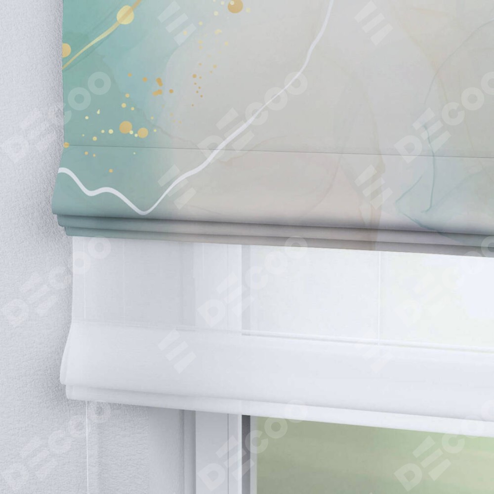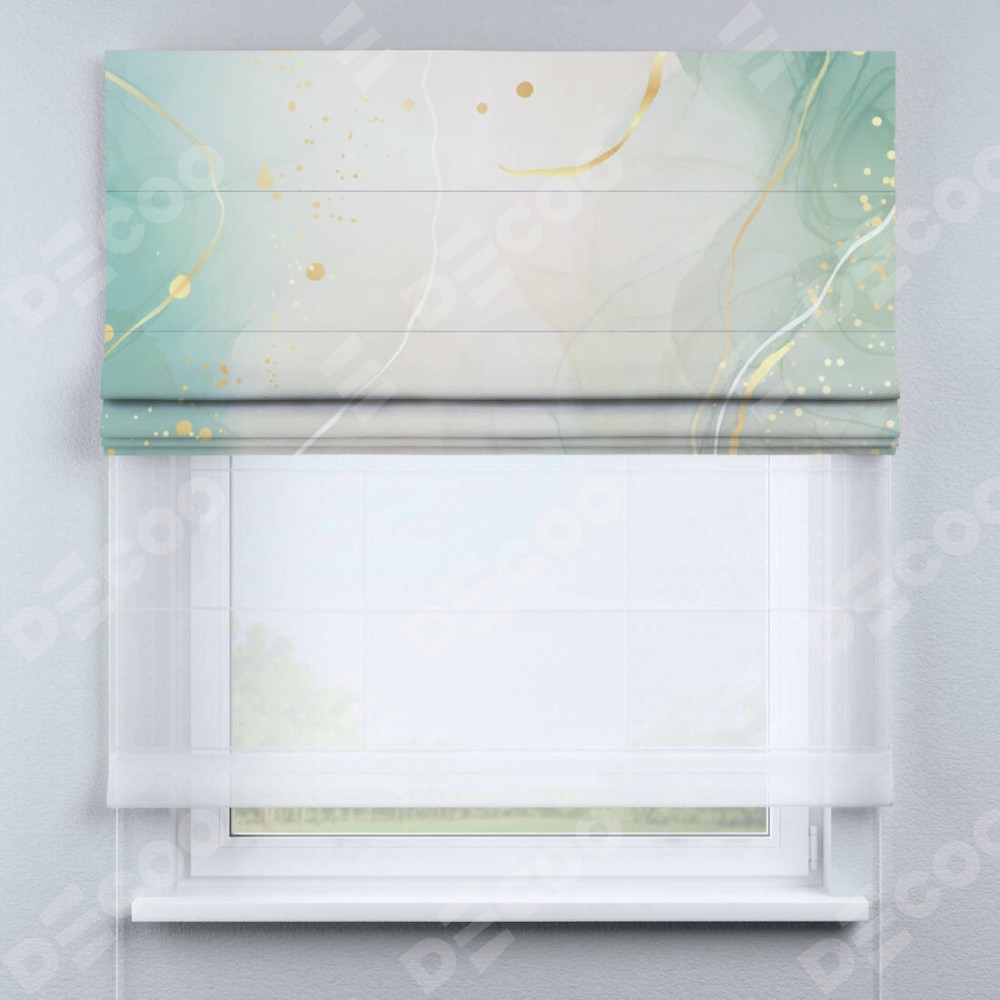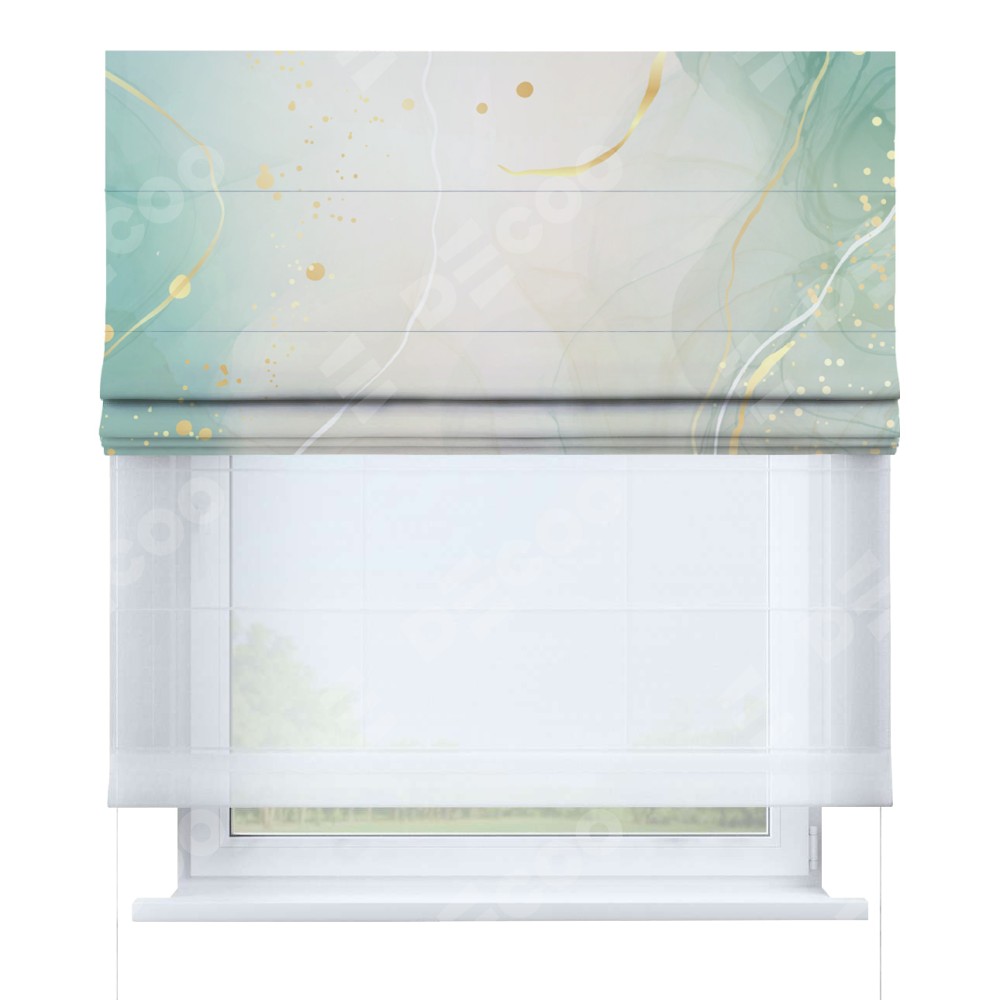 Римская штора день-ночь производителя «Cortin», используется для проёма, пошита из двух полотен, с лицевой блэкаут с нанесением сублимационной печати «Изумрудно-серый мрамор», вторая ткань тюль (по стандарту комплектуется тюль белого цвета артикул V-01). Имеет универсальный механизм и подходит для монтажа: на потолок, на стену и в нишу.