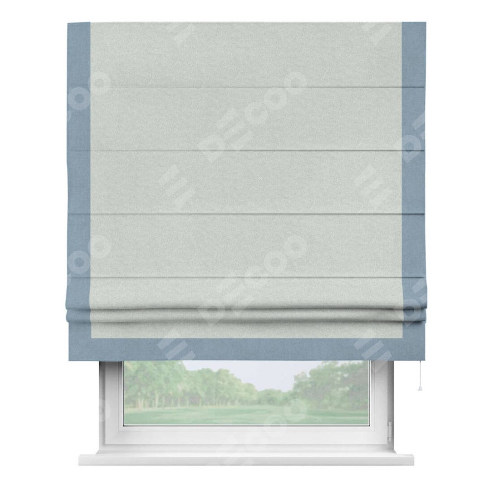 Римская штора производителя «Cortin», используется для проёма, пошита из ткани лён блэкаут белый, артикул 69451. Отделка шторы кантом «Виктория», ткань для канта используется из льна разной расцветки на выбор. Имеет универсальный механизм и подходит для монтажа: на потолок, на стену и в нишу.