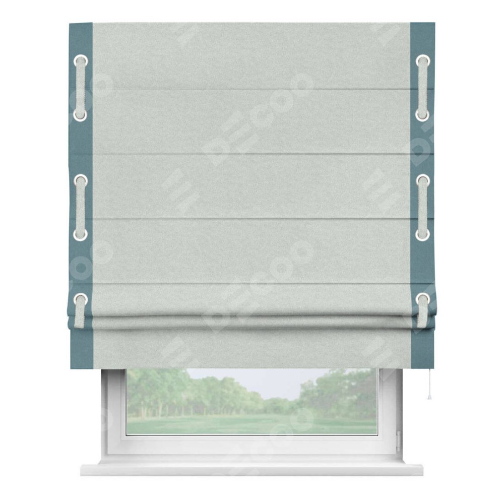 Римская штора производителя «Cortin», используется для проёма, пошита из ткани лён блэкаут белый, артикул 69451. Отделка шторы кантом «Стрим Дуо» на кантах расположены люверсы с пояском, ткань для канта используется из льна разной расцветки на выбор. Ткань для пояска обычно используется из основной ткани шторы, а так же можно сделать из любой расцветки по желанию. Имеет универсальный механизм и подходит для монтажа: на потолок, на стену и в нишу.