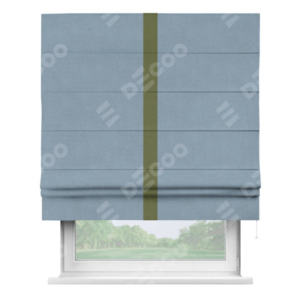 Римская штора производителя «Cortin», используется для проёма, пошита из ткани лён блэкаут голубой, артикул 69574. Отделка шторы кантом «Хайвэй», ткань для канта используется из льна разной расцветки на выбор. Имеет универсальный механизм и подходит для монтажа: на потолок, на стену и в нишу.