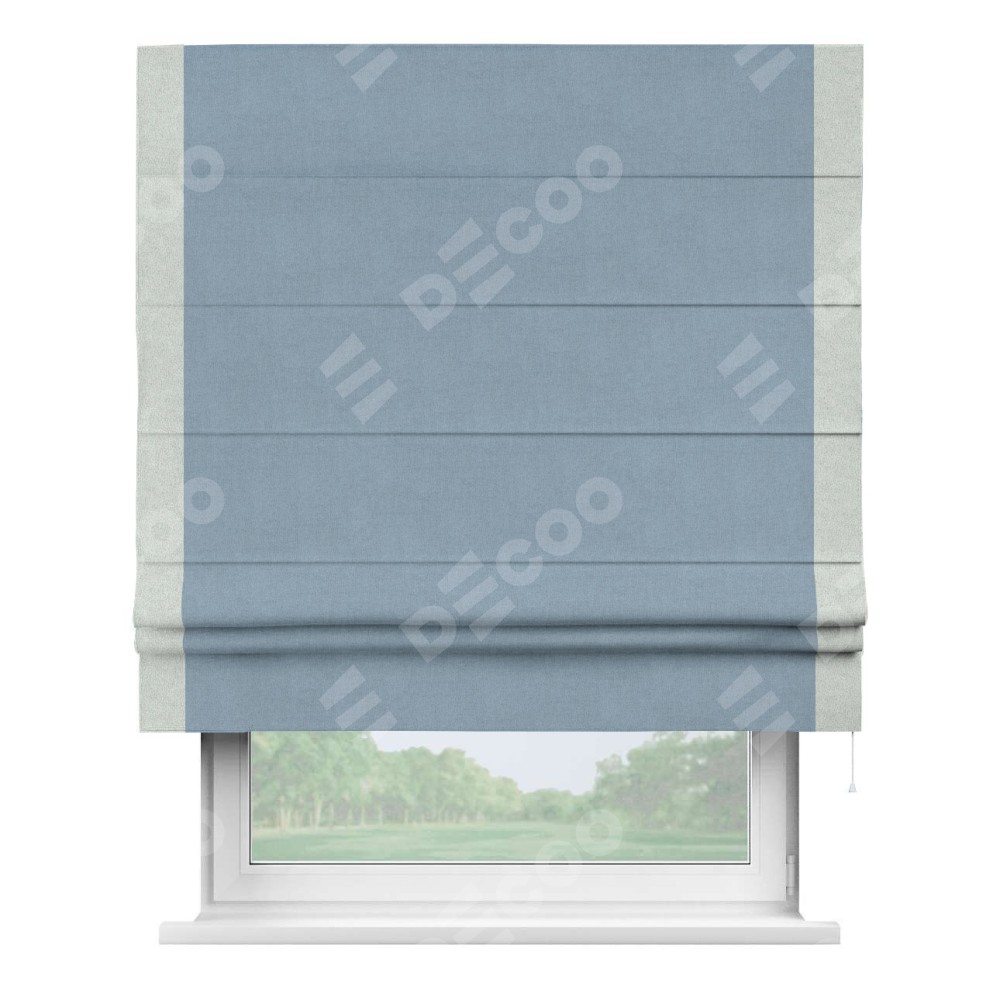 Римская штора производителя «Cortin», используется для проёма, пошита из ткани лён блэкаут голубой, артикул 69574. Отделка шторы кантом «Стрим Дуо», ткань для канта используется из льна разной расцветки на выбор. Имеет универсальный механизм и подходит для монтажа: на потолок, на стену и в нишу.