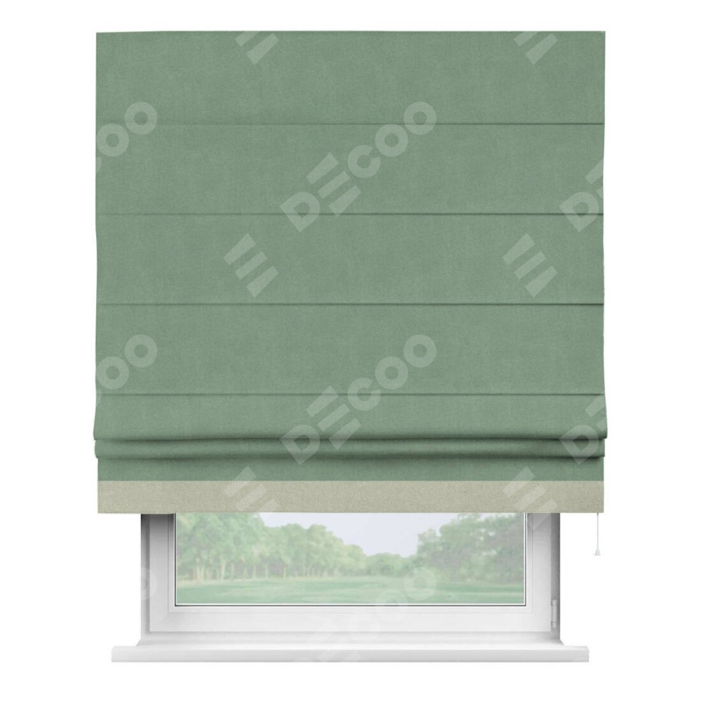 Римская штора производителя «Cortin», используется для проёма, пошита из ткани лён блэкаут светло-бирюзовый, артикул 69443. Отделка шторы кантом «Джестер», ткань для канта используется из льна разной расцветки на выбор. Имеет универсальный механизм и подходит для монтажа: на потолок, на стену и в нишу.