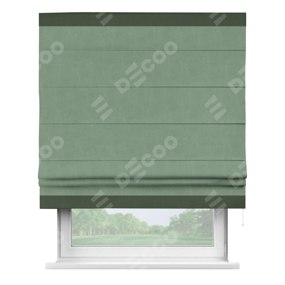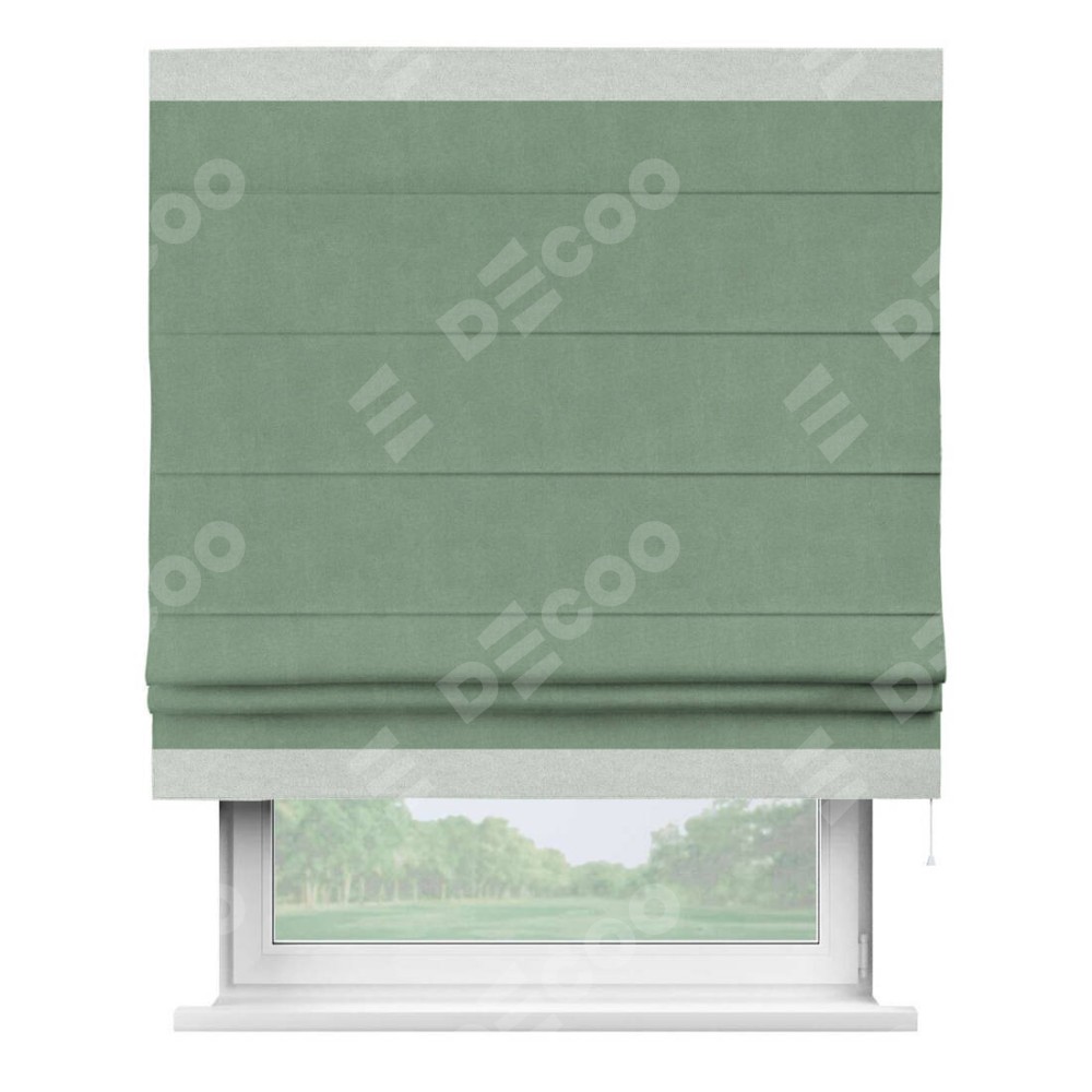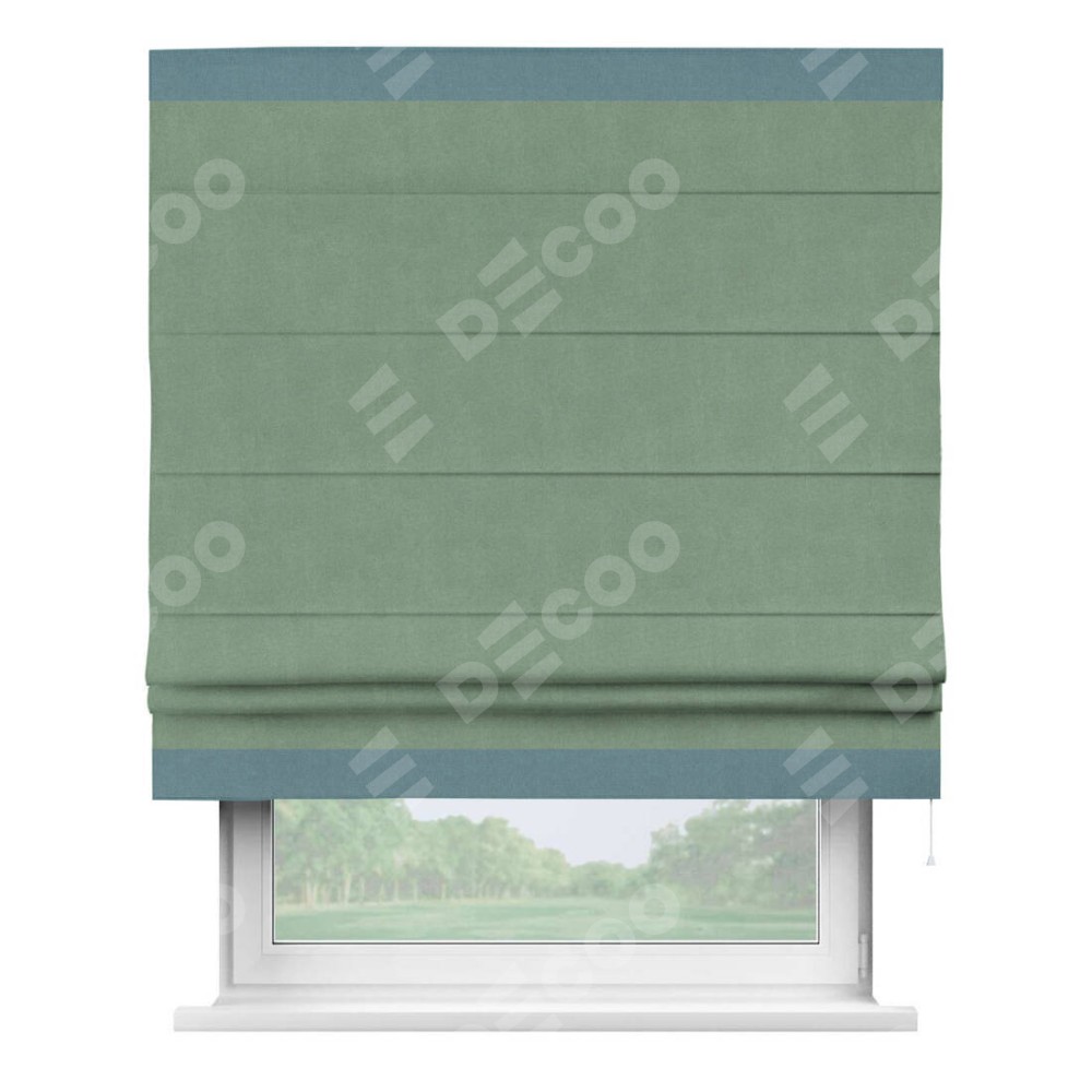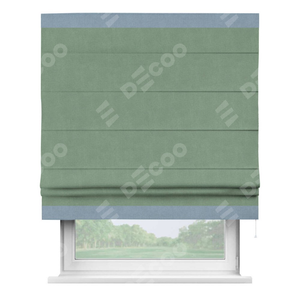 Римская штора производителя «Cortin», используется для проёма, пошита из ткани лён блэкаут светло-бирюзовый, артикул 69443. Отделка шторы кантом «Горизонт», ткань для канта используется из льна разной расцветки на выбор. Имеет универсальный механизм и подходит для монтажа: на потолок, на стену и в нишу.