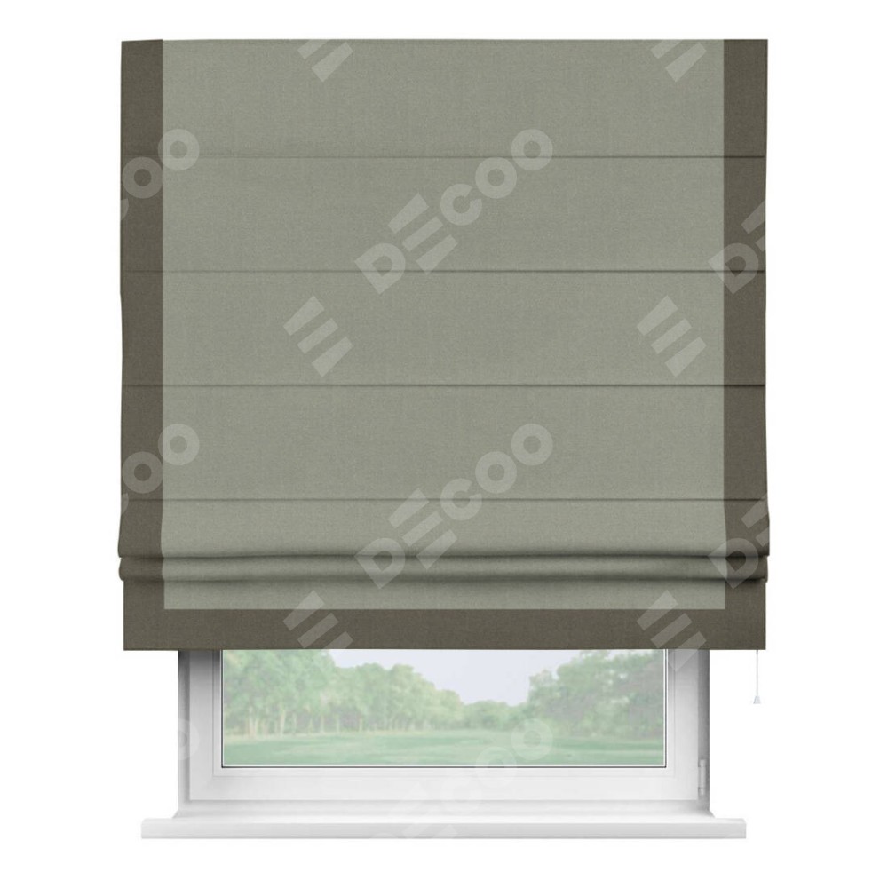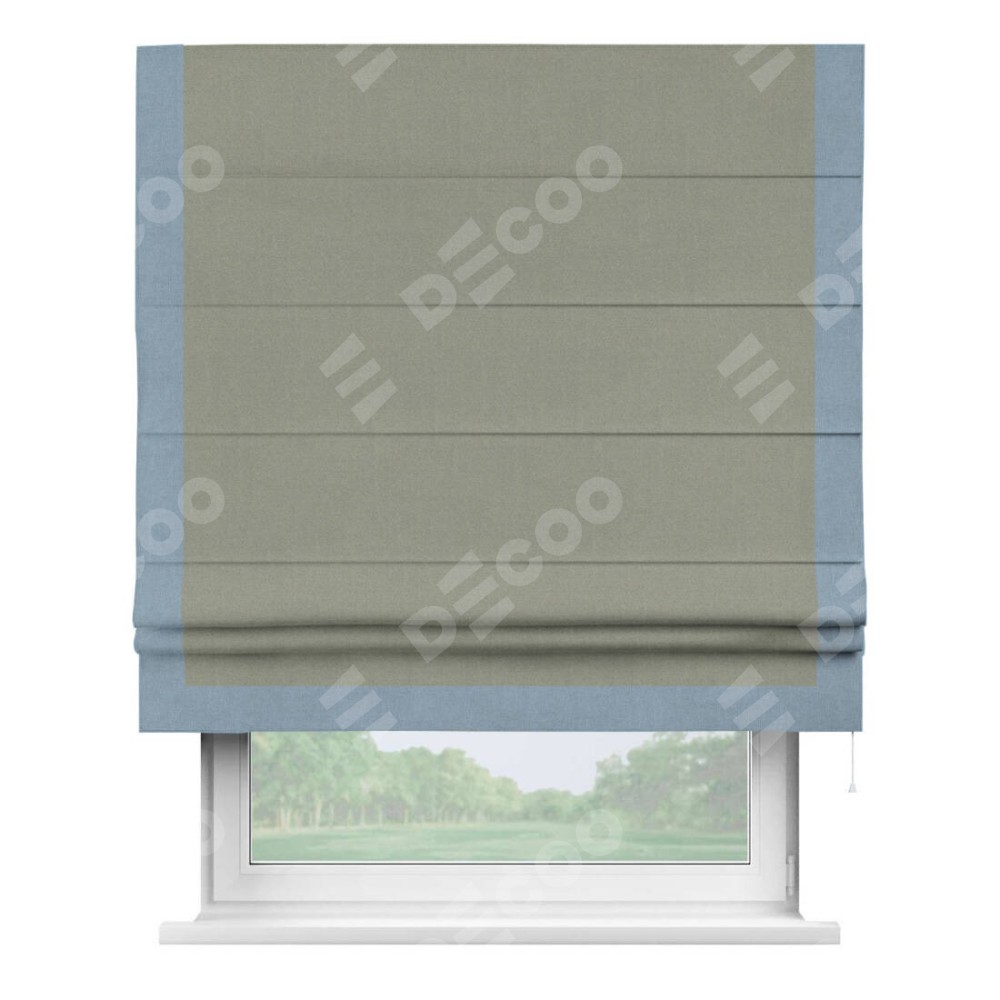 Римская штора производителя «Cortin», используется для проёма, пошита из ткани лён блэкаут светло-серый, артикул 69451. Отделка шторы кантом «Виктория», ткань для канта используется из льна разной расцветки на выбор. Имеет универсальный механизм и подходит для монтажа: на потолок, на стену и в нишу.