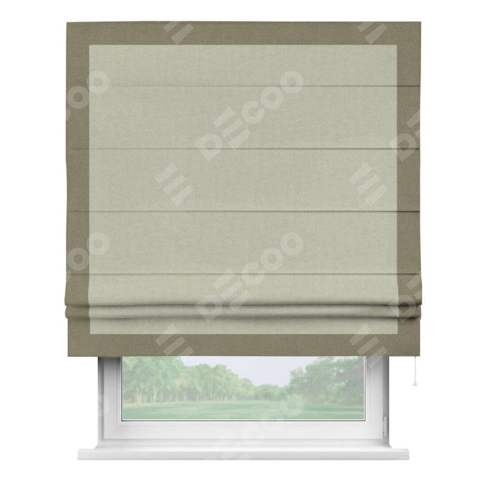 Римская штора производителя «Cortin», используется для проёма, пошита из ткани лён блэкаут серо-бежевый, артикул 69450. Отделка шторы кантом «Чесс», ткань для канта используется из льна разной расцветки на выбор. Имеет универсальный механизм и подходит для монтажа: на потолок, на стену и в нишу.