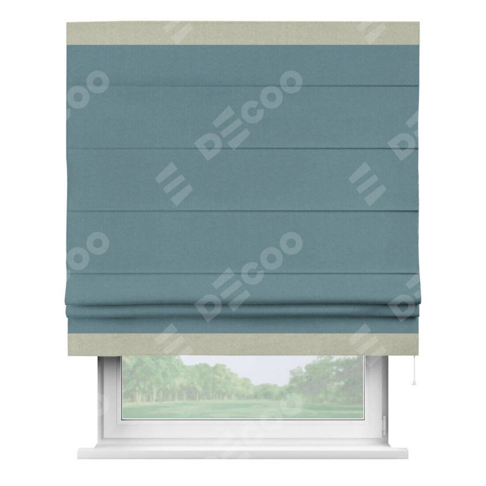 Римская штора производителя «Cortin», используется для проёма, пошита из ткани лён блэкаут синий, артикул 69528. Отделка шторы кантом «Горизонт», ткань для канта используется из льна разной расцветки на выбор. Имеет универсальный механизм и подходит для монтажа: на потолок, на стену и в нишу.