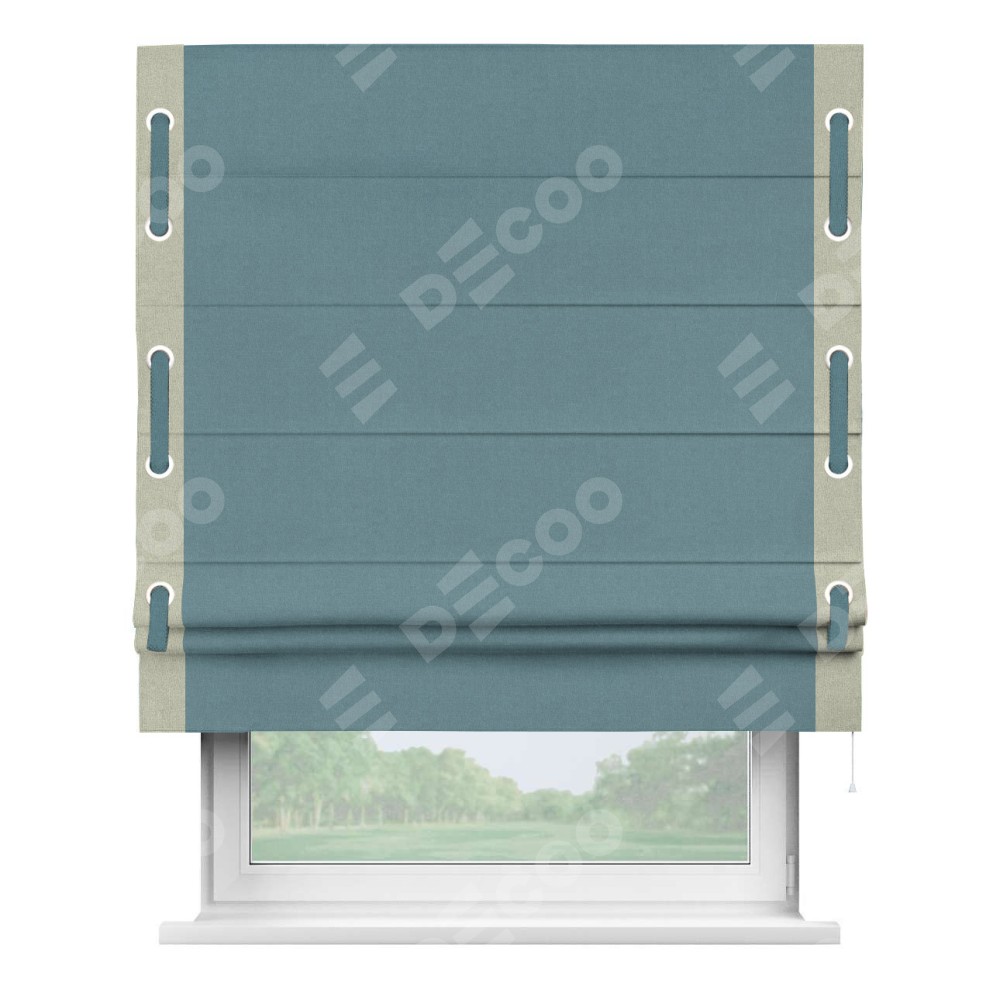 Римская штора производителя «Cortin», используется для проёма, пошита из ткани лён блэкаут синий, артикул 69528. Отделка шторы кантом «Стрим Дуо» на кантах расположены люверсы с пояском, ткань для канта используется из льна разной расцветки на выбор. Ткань для пояска обычно используется из основной ткани шторы, а так же можно сделать из любой расцветки по желанию. Имеет универсальный механизм и подходит для монтажа: на потолок, на стену и в нишу.