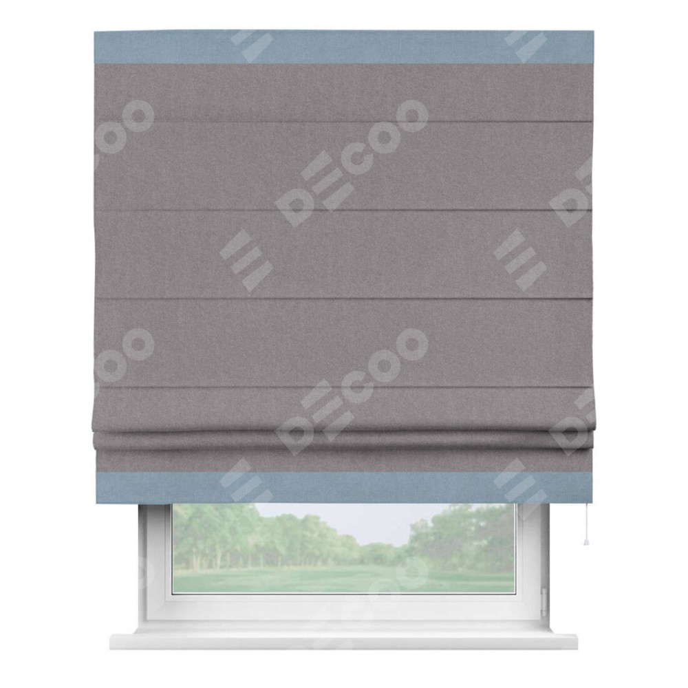 Римская штора производителя «Cortin», используется для проёма, пошита из ткани лён блэкаут сиреневый, артикул 69576. Отделка шторы кантом «Горизонт», ткань для канта используется из льна разной расцветки на выбор. Имеет универсальный механизм и подходит для монтажа: на потолок, на стену и в нишу.