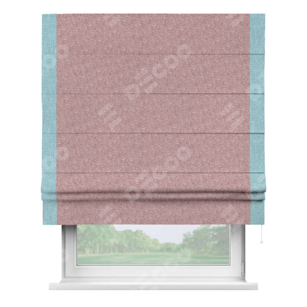 Римская штора производителя «Cortin», используется для проёма, пошита из ткани лён кашемир розовая пудра, артикул 21619. Отделка шторы кантом «Стрим Дуо», ткань для канта используется из льна разной расцветки на выбор. Имеет универсальный механизм и подходит для монтажа: на потолок, на стену и в нишу.