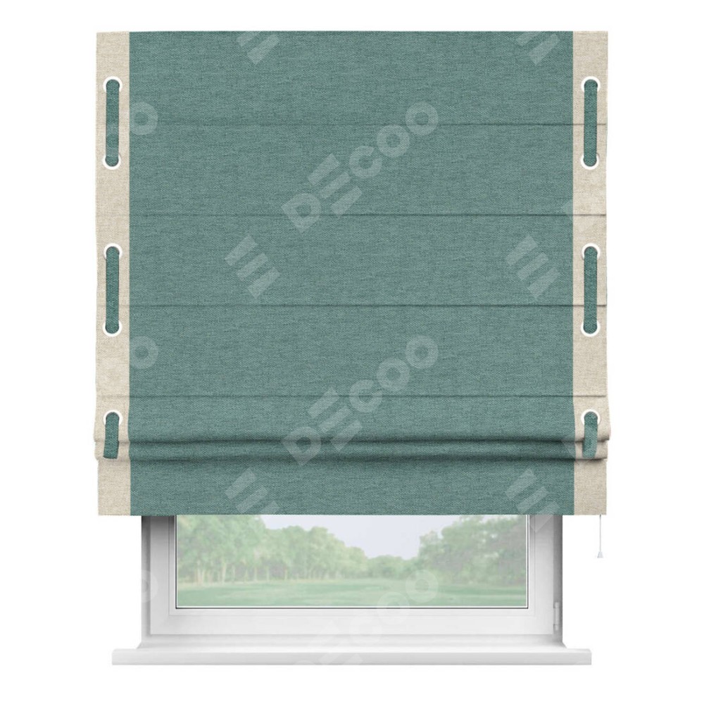 Римская штора производителя «Cortin», используется для проёма, пошита из ткани стиф димаут бирюзовый, артикул 18196. Отделка шторы кантом «Стрим Дуо» на кантах расположены люверсы с пояском, ткань для канта используется из стифа разной расцветки на выбор. Ткань для пояска обычно используется из основной ткани шторы, а так же можно сделать из любой расцветки по желанию. Имеет универсальный механизм и подходит для монтажа: на потолок, на стену и в нишу.