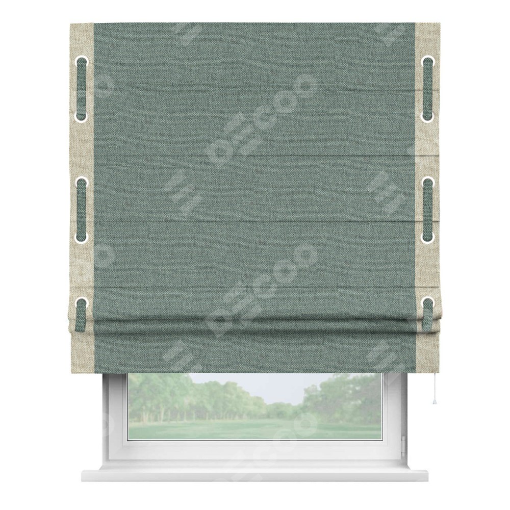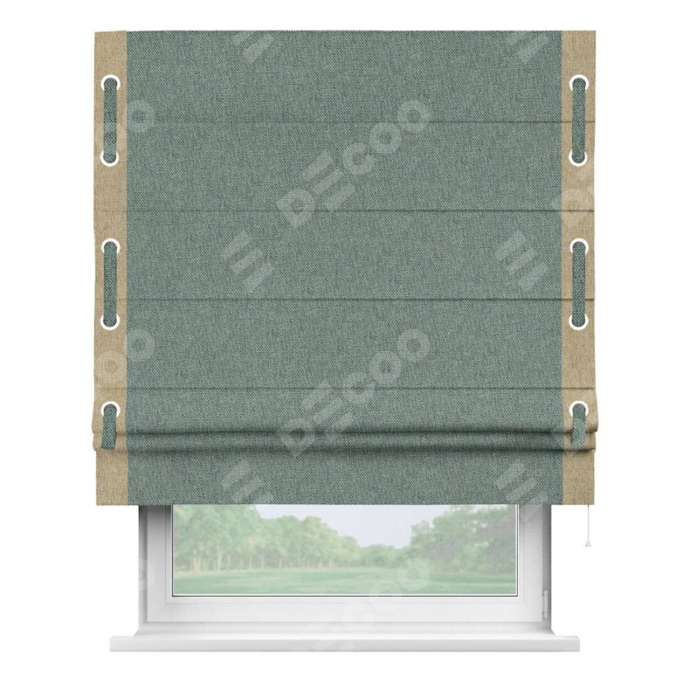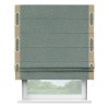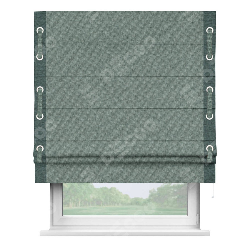 Римская штора производителя «Cortin», используется для проёма, пошита из ткани стиф димаут серо-голубой, артикул 44029. Отделка шторы кантом «Стрим Дуо» на кантах расположены люверсы с пояском, ткань для канта используется из стифа разной расцветки на выбор. Ткань для пояска обычно используется из основной ткани шторы, а так же можно сделать из любой расцветки по желанию. Имеет универсальный механизм и подходит для монтажа: на потолок, на стену и в нишу.