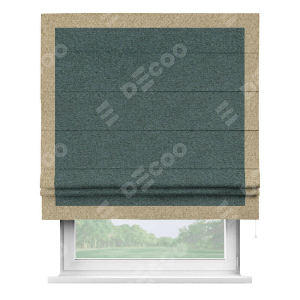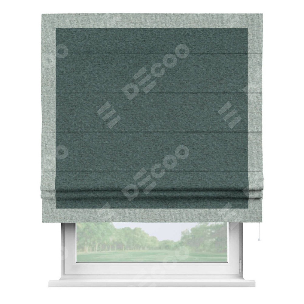 Римская штора производителя «Cortin», используется для проёма, пошита из ткани стиф димаут сине-зелёный, артикул 18194. Отделка шторы кантом «Чесс», ткань для канта используется из стифа разной расцветки на выбор. Имеет универсальный механизм и подходит для монтажа: на потолок, на стену и в нишу.