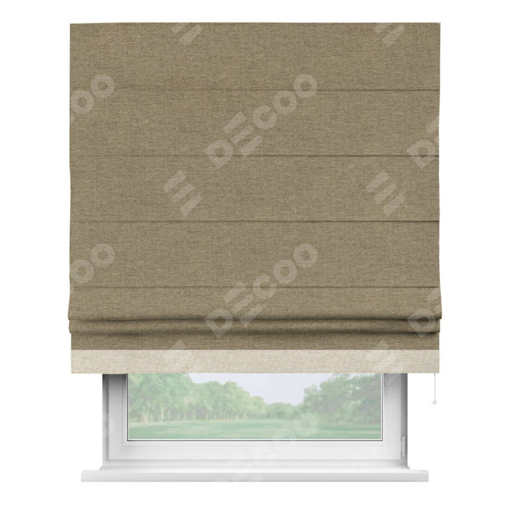 Римская штора производителя «Cortin», используется для проёма, пошита из ткани стиф димаут тёмно-бежевый, артикул 18085. Отделка шторы кантом «Джестер», ткань для канта используется из стифа разной расцветки на выбор. Имеет универсальный механизм и подходит для монтажа: на потолок, на стену и в нишу.