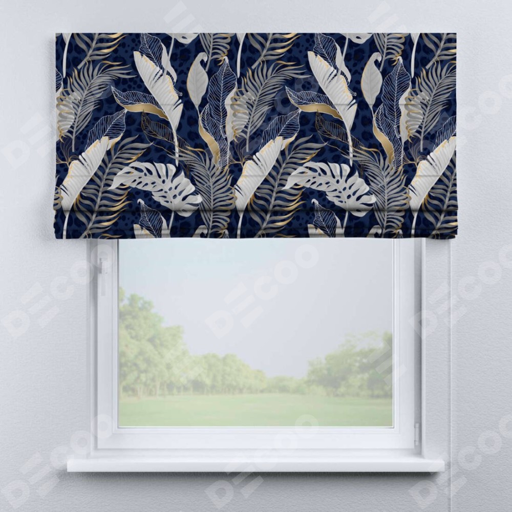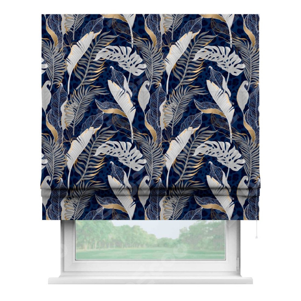 Римская штора «Кортин» для проема «Сине-золотые джунгли» отлично подойдёт для интерьера: в офис, на балкон и в кухню.