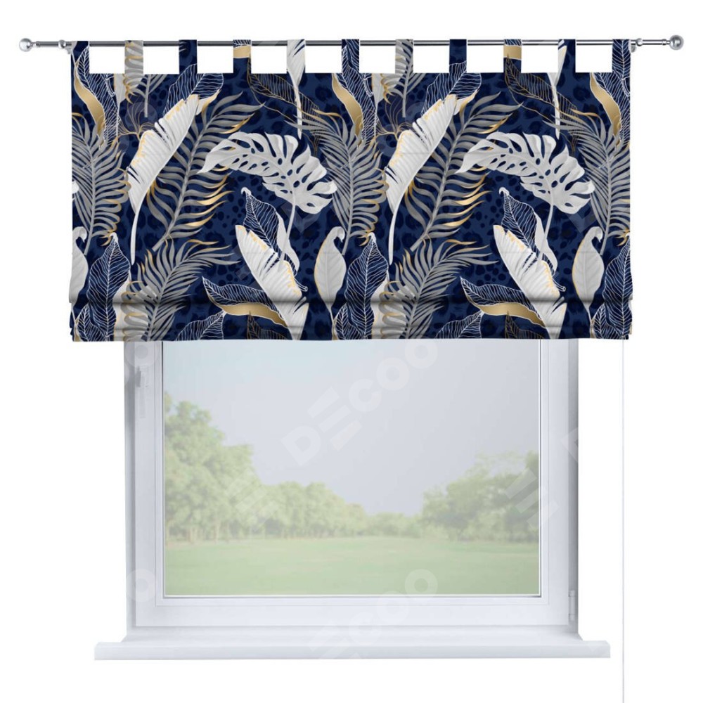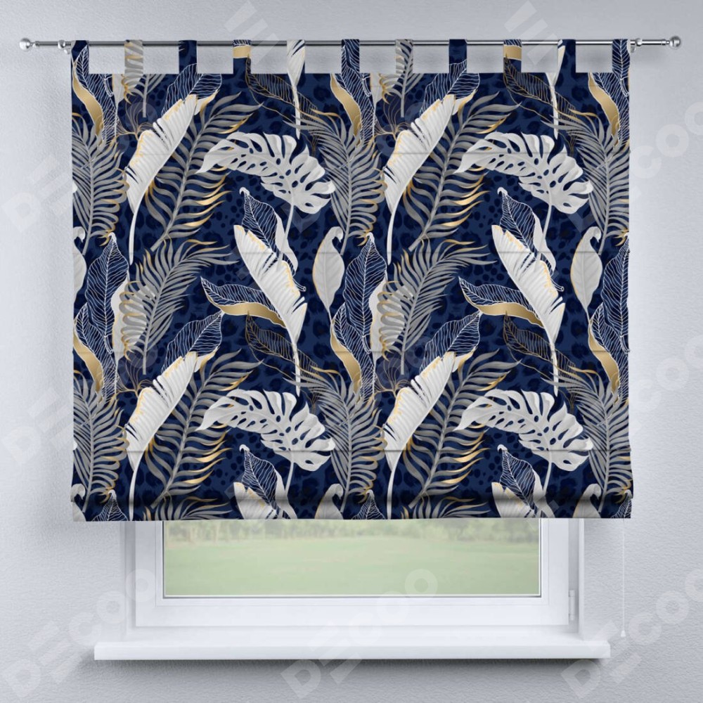 Римская штора производителя «Cortin», используется для проёма, пошита из ткани блэкаут с нанесением сублимационной печати «Сине-золотые джунгли». Данная модель пошита на петлях, комплектуется на выбор круглым карнизом и подходит для монтажа на стену. Римская штора на петлях имеет простую систему регулировки высоты, отличительным преимуществом данной модели является простой способ монтажа. Достаточно повесить ее на трубу и штора готова!