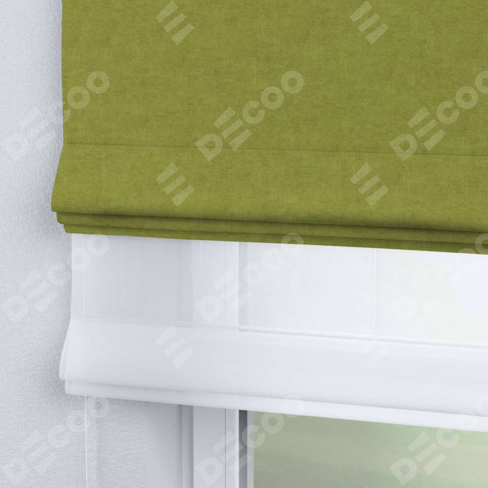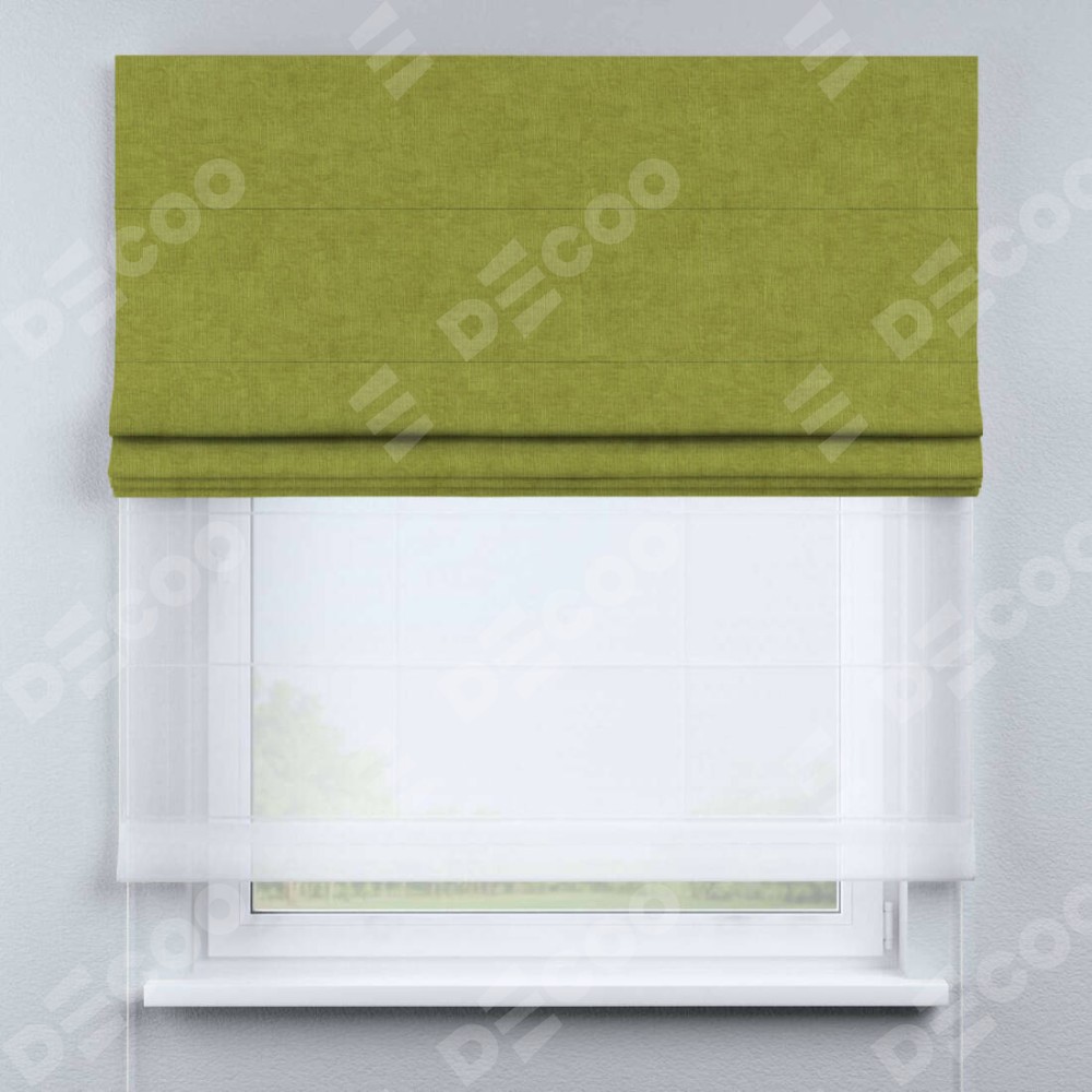 Римская штора день-ночь производителя «Cortin», используется для проёма, пошита из двух полотен, с лицевой стороны канвас зелёное яблоко артикул v-370, вторая ткань тюль (по стандарту комплектуется тюль белого цвета артикул V-01). Имеет универсальный механизм и подходит для монтажа: на потолок, на стену и в нишу.