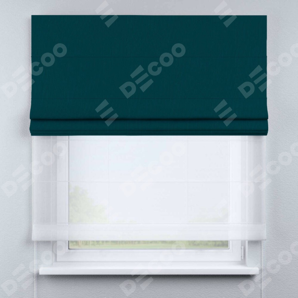Римская штора день-ночь производителя «Cortin», используется для проёма, пошита из двух полотен, с лицевой стороны канвас изумрудный артикул v-12487, вторая ткань тюль (по стандарту комплектуется тюль белого цвета артикул V-01). Имеет универсальный механизм и подходит для монтажа: на потолок, на стену и в нишу.