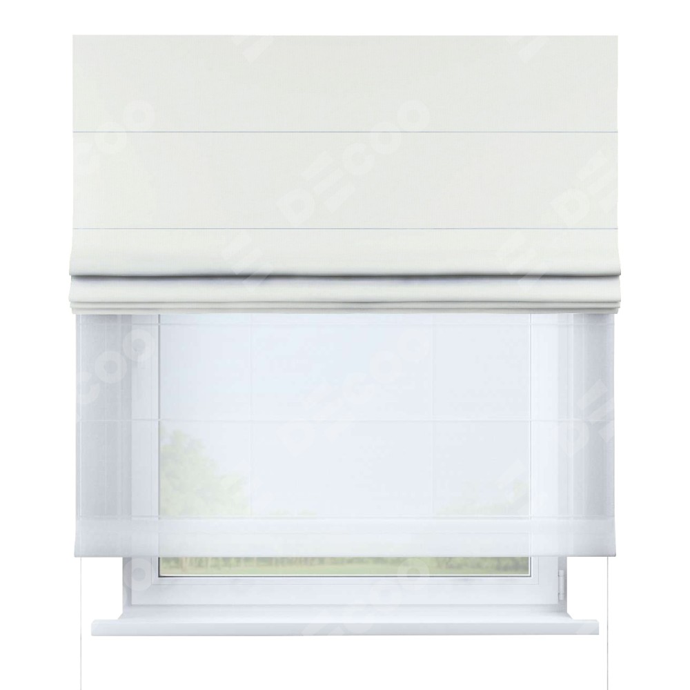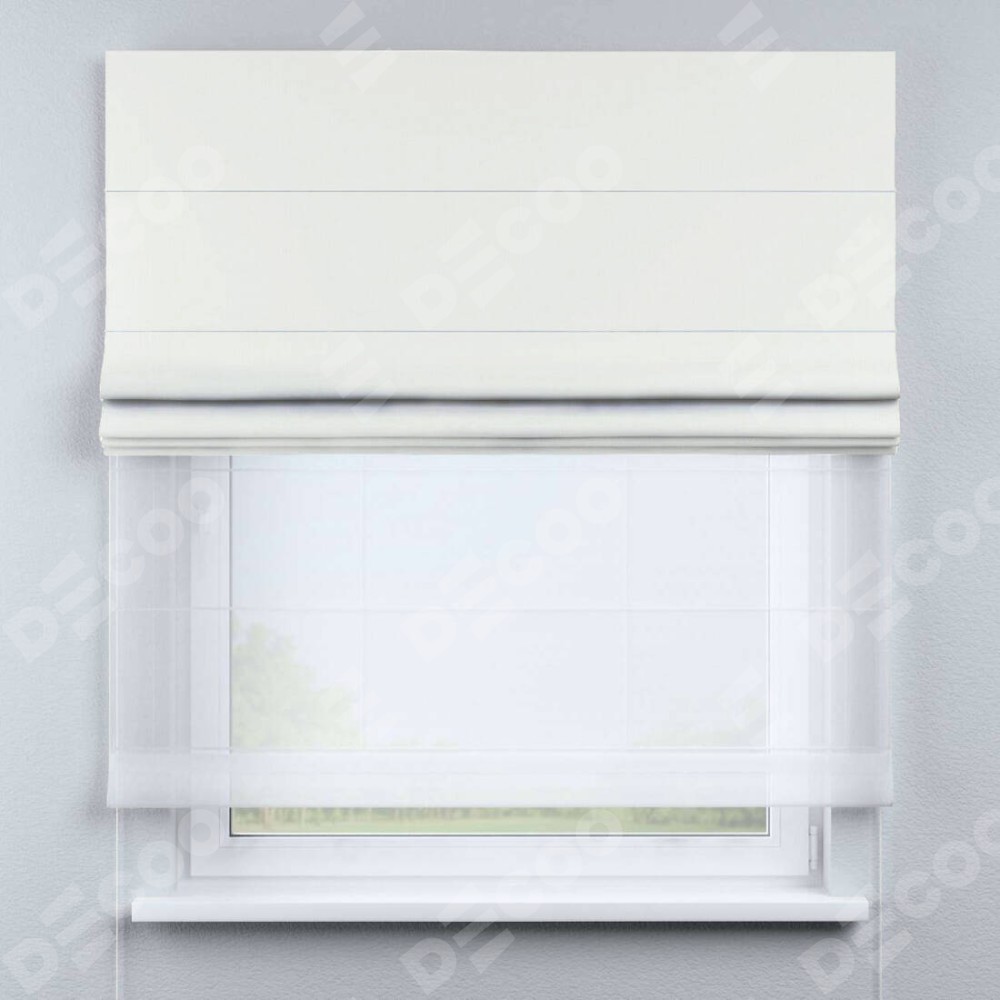 Римская штора день-ночь производителя «Cortin», используется для проёма, пошита из двух полотен, с лицевой стороны канвас молочный артикул v-93, вторая ткань тюль (по стандарту комплектуется тюль белого цвета артикул V-01). Имеет универсальный механизм и подходит для монтажа: на потолок, на стену и в нишу.