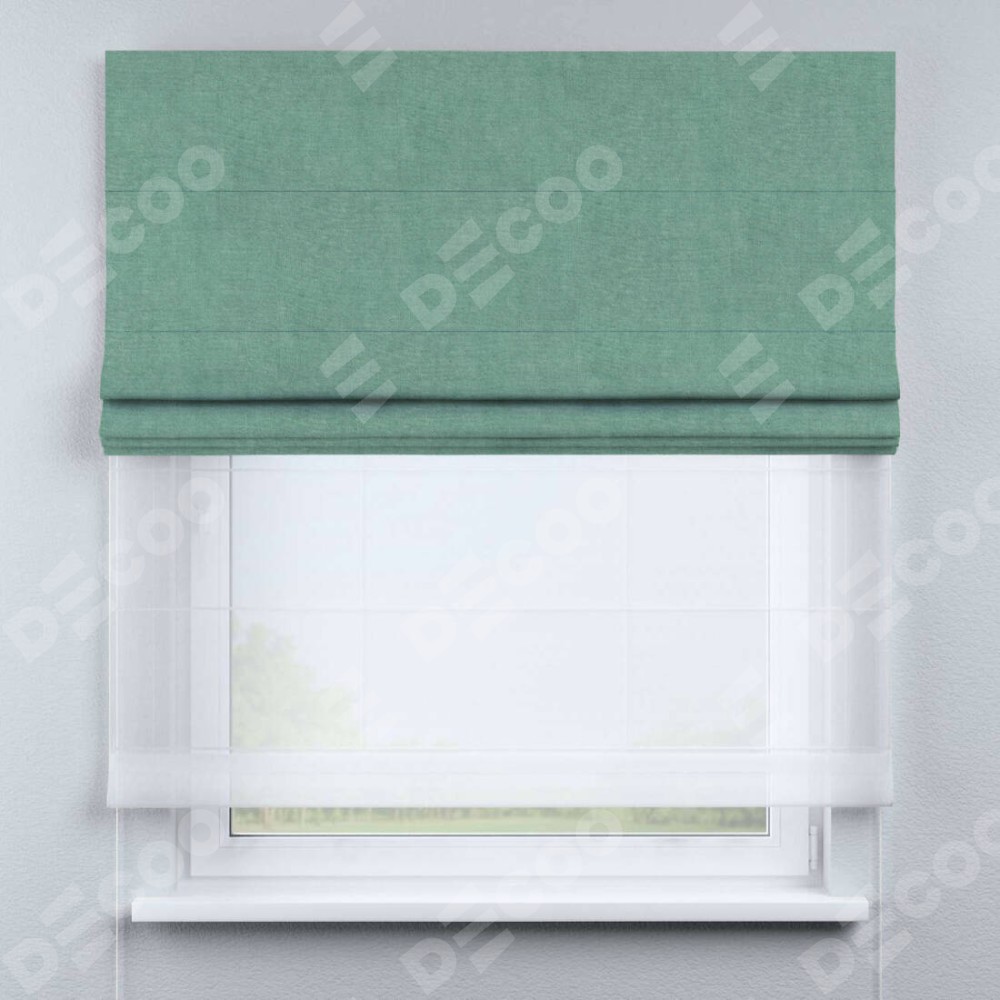 Римская штора день-ночь производителя «Cortin», используется для проёма, пошита из двух полотен, с лицевой стороны канвас мятный артикул v-248, вторая ткань тюль (по стандарту комплектуется тюль белого цвета артикул V-01). Имеет универсальный механизм и подходит для монтажа: на потолок, на стену и в нишу.