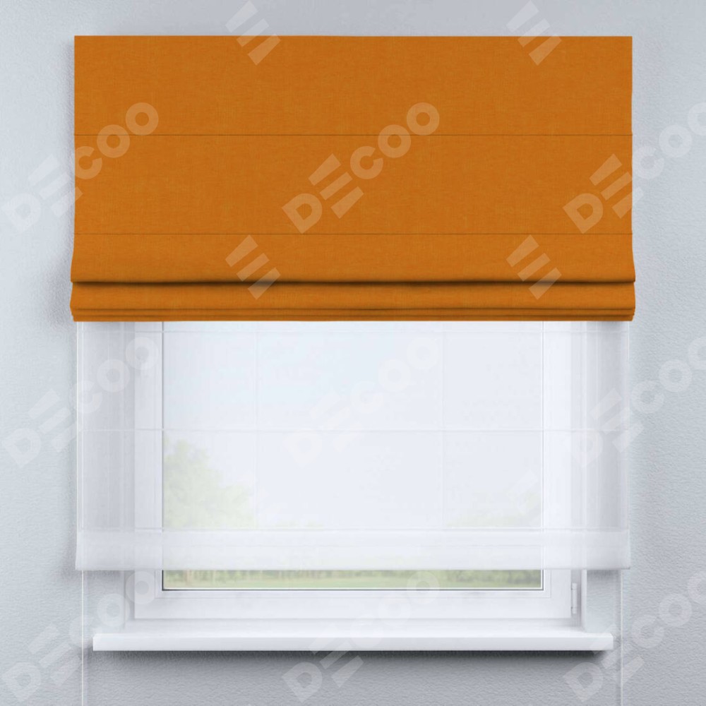 Римская штора день-ночь производителя «Cortin», используется для проёма, пошита из двух полотен, с лицевой стороны канвас оранжевый артикул v-106, вторая ткань тюль (по стандарту комплектуется тюль белого цвета артикул V-01). Имеет универсальный механизм и подходит для монтажа: на потолок, на стену и в нишу.