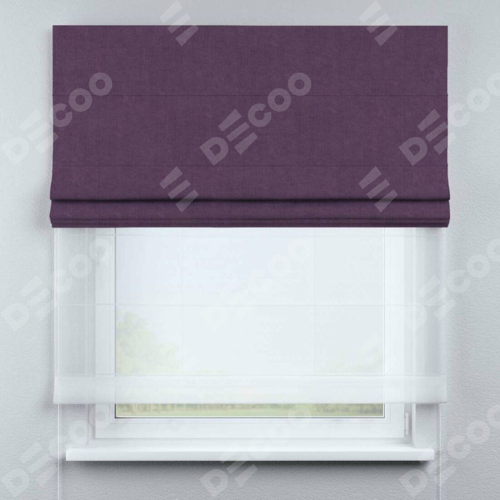 Римская штора день-ночь производителя «Cortin», используется для проёма, пошита из двух полотен, с лицевой стороны канвас сиреневый артикул v-98, вторая ткань тюль (по стандарту комплектуется тюль белого цвета артикул V-01). Имеет универсальный механизм и подходит для монтажа: на потолок, на стену и в нишу.