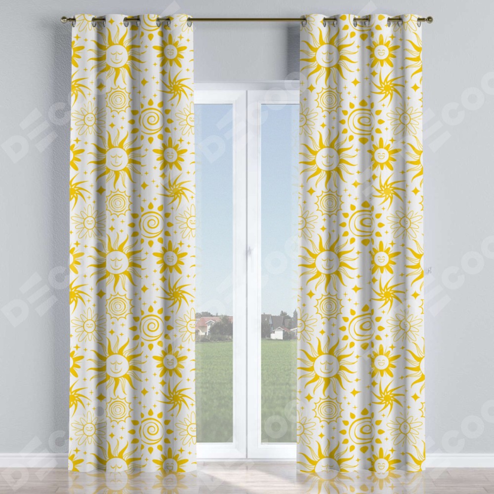 Комплект прямых штор, от производителя «Cortin», пошиты из ткани блэкаут с нанесением сублимационной печати «Солнышки». Данная модель пошита на люверсах, комплектуется на выбор круглым карнизом и подходит для монтажа на стену или потолок. Прямые шторы на люверсах шьются по стандарту с коэффициентом 1/2 (на 100 см. ширины проёма 200 см. ширины ткани), отличительным преимуществом данной модели является простой способ монтажа. Достаточно повесить ее на трубу и штора готова!