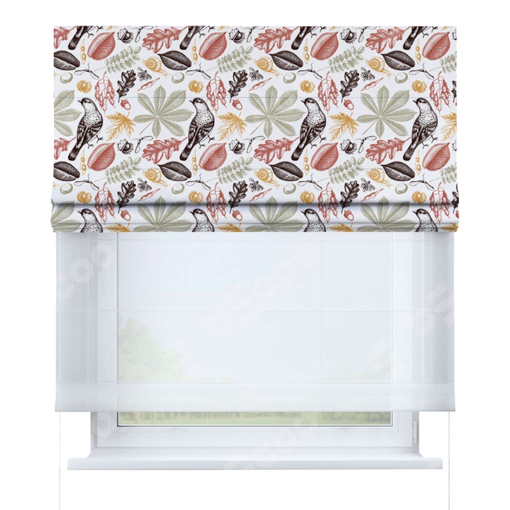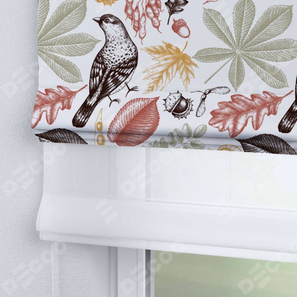 Римская штора день-ночь производителя «Cortin», используется для проёма, пошита из двух полотен, с лицевой блэкаут с нанесением сублимационной печати «Краски осени», вторая ткань тюль (по стандарту комплектуется тюль белого цвета артикул V-01). Имеет универсальный механизм и подходит для монтажа: на потолок, на стену и в нишу.