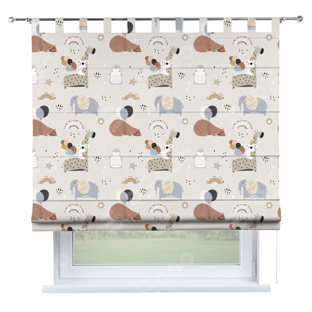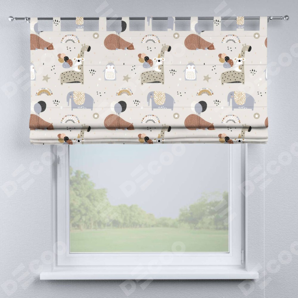 Римская штора производителя «Cortin», используется для проёма, пошита из ткани блэкаут с нанесением сублимационной печати «Вечеринка животных». Данная модель пошита на петлях, комплектуется на выбор круглым карнизом и подходит для монтажа на стену. Римская штора на петлях имеет простую систему регулировки высоты, отличительным преимуществом данной модели является простой способ монтажа. Достаточно повесить ее на трубу и штора готова!