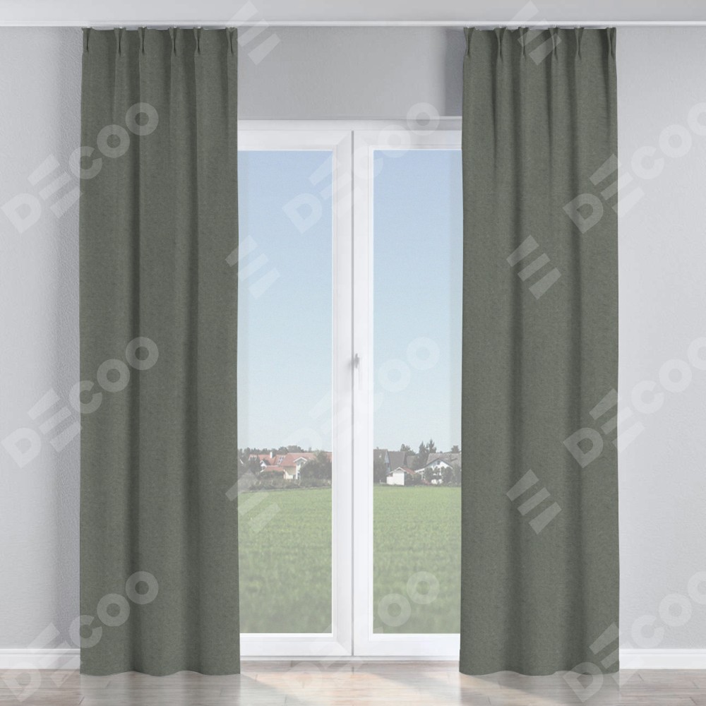 Комплект прямых штор, от производителя «Cortin», пошиты из ткани лён димаут тёмно-серый, артикул ткани 91011. С изнаночной стороны в верхней части штор пристрачивается шторная лента с декоративными складками «Кустик». Для создания элегантных складок прямые шторы шьются по стандарту с коэффициентом 1:2 (на 100 см. ширины проёма 200 см. ширины ткани).
