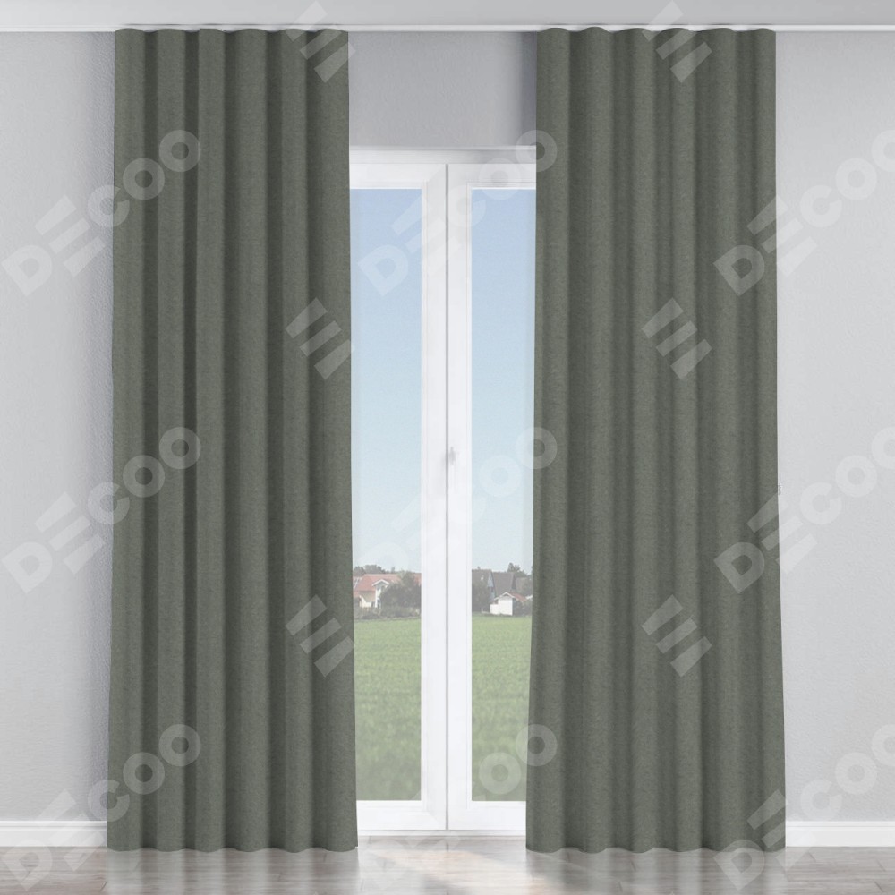Комплект прямых штор, от производителя «Cortin», пошиты из ткани лён димаут тёмно-серый, артикул ткани 91011. С изнаночной стороны в верхней части штор пристрачивается шторная лента с декоративными складками «Волна». Для создания элегантных складок прямые шторы шьются по стандарту с коэффициентом 1:2 (на 100 см. ширины проёма 200 см. ширины ткани).