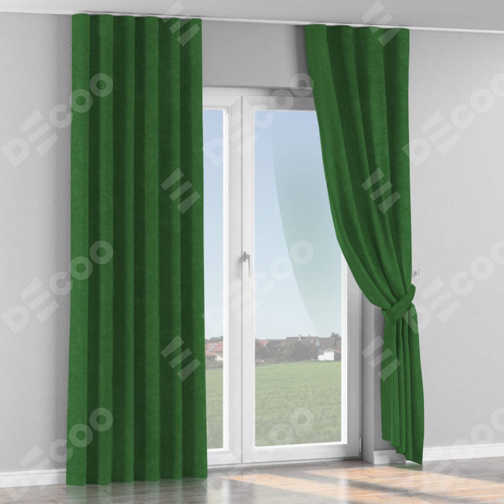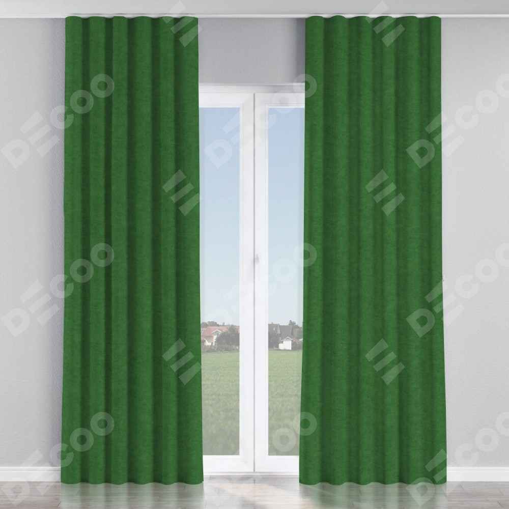 Комплект прямых штор, от производителя «Cortin», пошиты из ткани канвас зелёный, артикул ткани v-16. С изнаночной стороны в верхней части штор пристрачивается шторная лента с декоративными складками «Волна». Для создания элегантных складок прямые шторы шьются по стандарту с коэффициентом 1:2 (на 100 см. ширины проёма 200 см. ширины ткани).