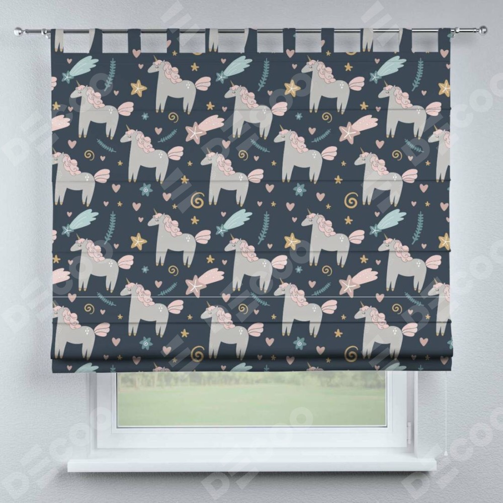 Римская штора производителя «Cortin», используется для проёма, пошита из ткани блэкаут с нанесением сублимационной печати «Милые единороги». Данная модель пошита на петлях, комплектуется на выбор круглым карнизом и подходит для монтажа на стену. Римская штора на петлях имеет простую систему регулировки высоты, отличительным преимуществом данной модели является простой способ монтажа. Достаточно повесить ее на трубу и штора готова!