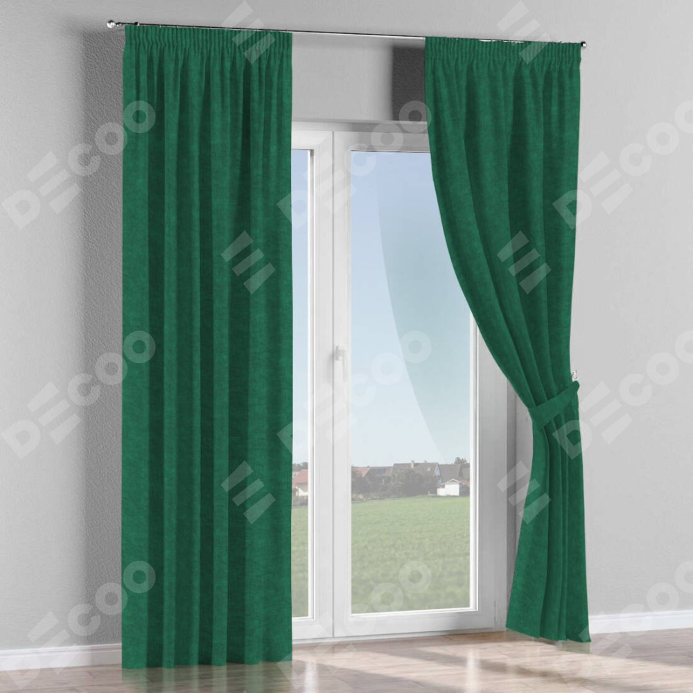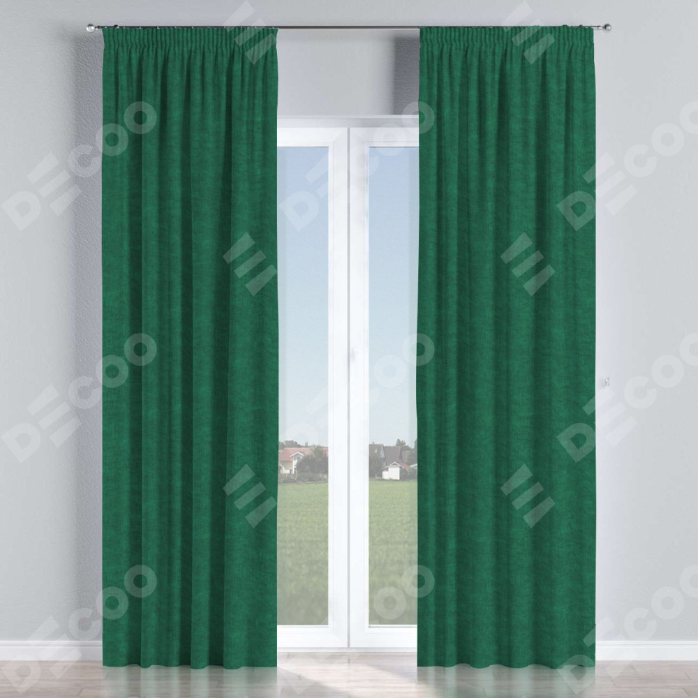 Комплект прямых штор, от производителя «Cortin», пошиты из ткани канвас тёмно-зелёный, артикул ткани v-469. С изнаночной стороны в верхней части штор пристрачивается шторная лента с декоративными складками «Карандаш». Для создания элегантных складок прямые шторы шьются по стандарту с коэффициентом 1:2 (на 100 см. ширины проёма 200 см. ширины ткани).