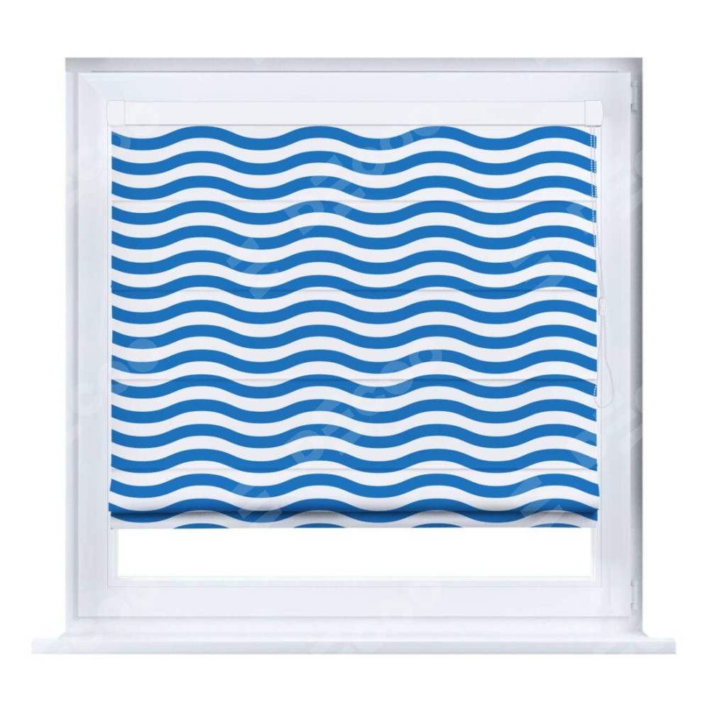 Римская штора производителя «Cortin», устанавливается на створку окна, пошита из ткани блэкаут с нанесением сублимационной печати «Волнистые линии». Штора шьётся по индивидуальным размерам, для данного типа римской шторы возможная ширина от 35 до 150 см., высота до 250 см.