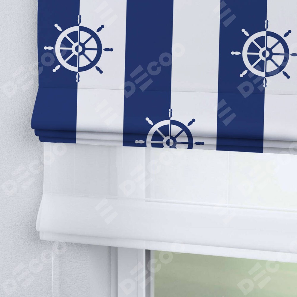 Римская штора день-ночь производителя «Cortin», используется для проёма, пошита из двух полотен, с лицевой блэкаут с нанесением сублимационной печати «Полоски и штурвалы», вторая ткань тюль (по стандарту комплектуется тюль белого цвета артикул V-01). Имеет универсальный механизм и подходит для монтажа: на потолок, на стену и в нишу.