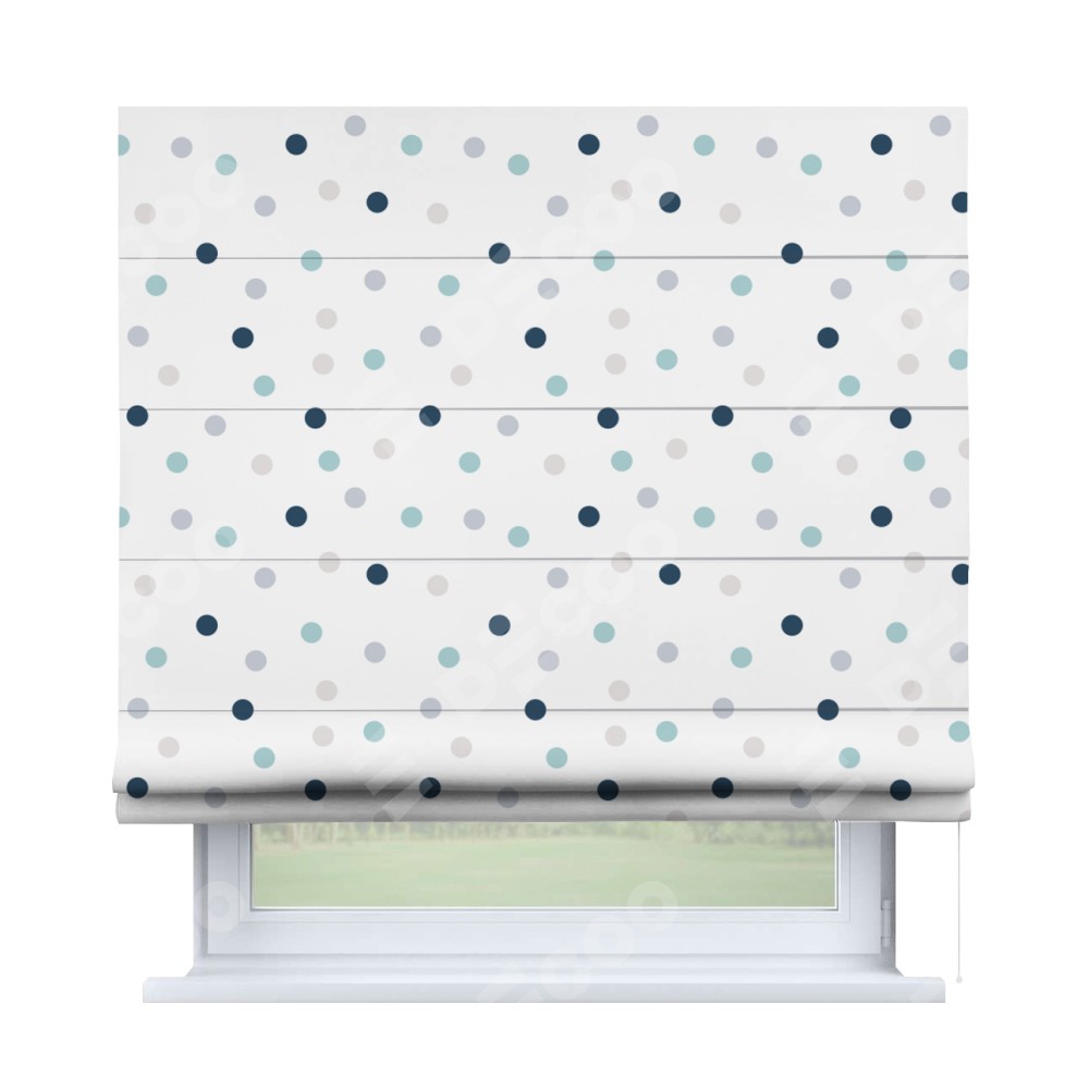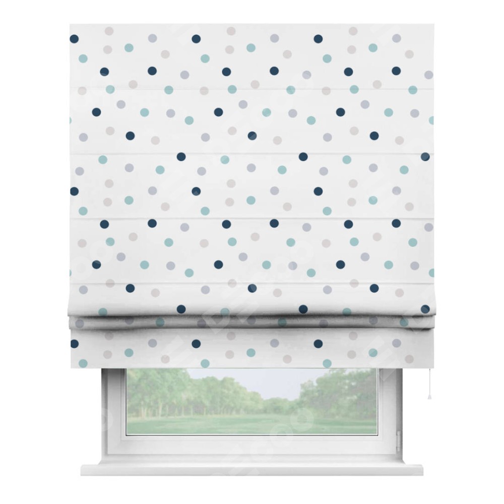 Римская штора производителя «Cortin», используется для проёма, пошита из ткани блэкаут с нанесением сублимационной печати «Точки». Имеет универсальный механизм и подходит для монтажа: на потолок, на стену и в нишу.