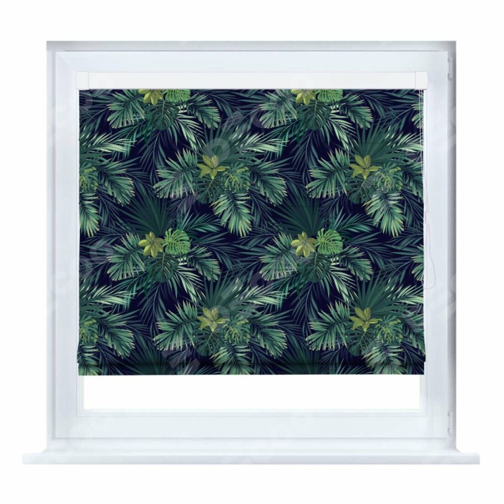 Римская штора производителя «Cortin», устанавливается на створку окна, пошита из ткани блэкаут с нанесением сублимационной печати «Пальмовые листья». Штора шьётся по индивидуальным размерам, для данного типа римской шторы возможная ширина от 35 до 150 см., высота до 250 см.
