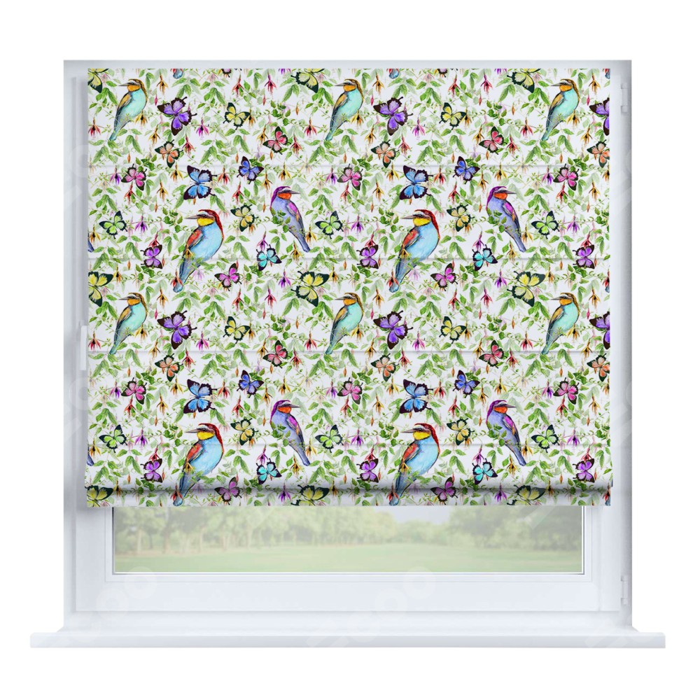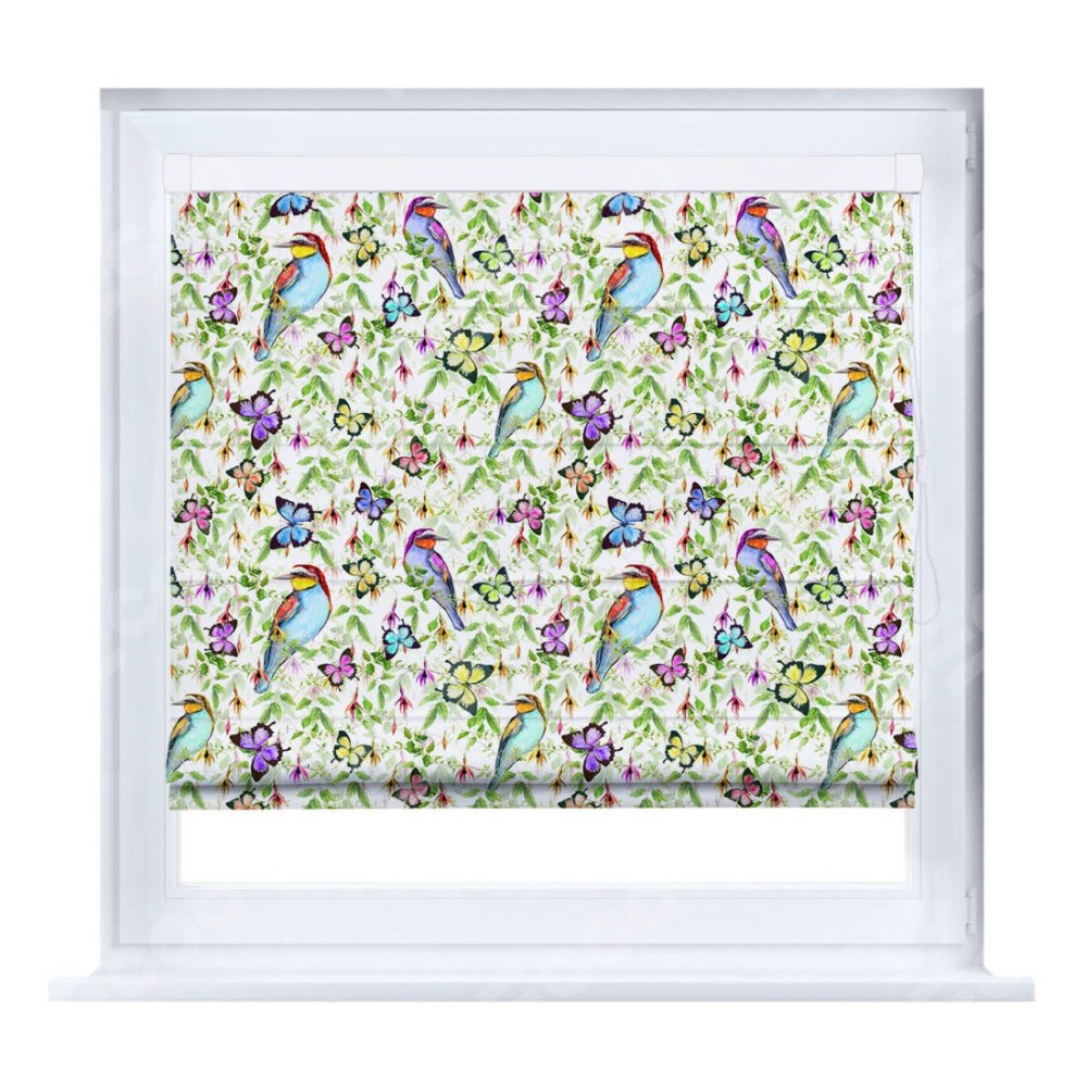 Римская штора «Кортин» на створку «Тропические птицы» предоставлена в следующих характеристиках: