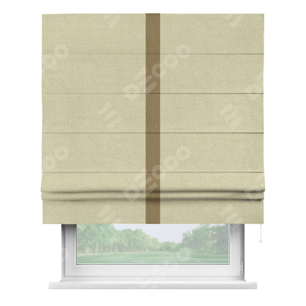 Римская штора производителя «Cortin», используется для проёма, пошита из ткани лён димаут шампань, артикул 90994. Отделка шторы кантом «Хайвэй», ткань для канта используется из льна димаут разной расцветки на выбор. Имеет универсальный механизм и подходит для монтажа: на потолок, на стену и в нишу.