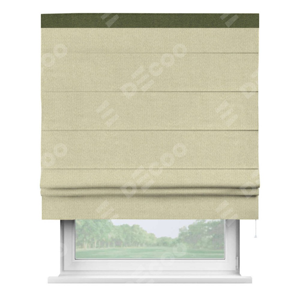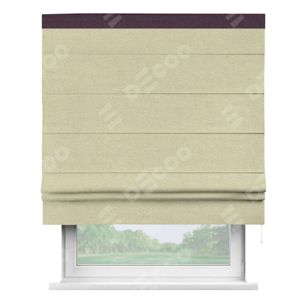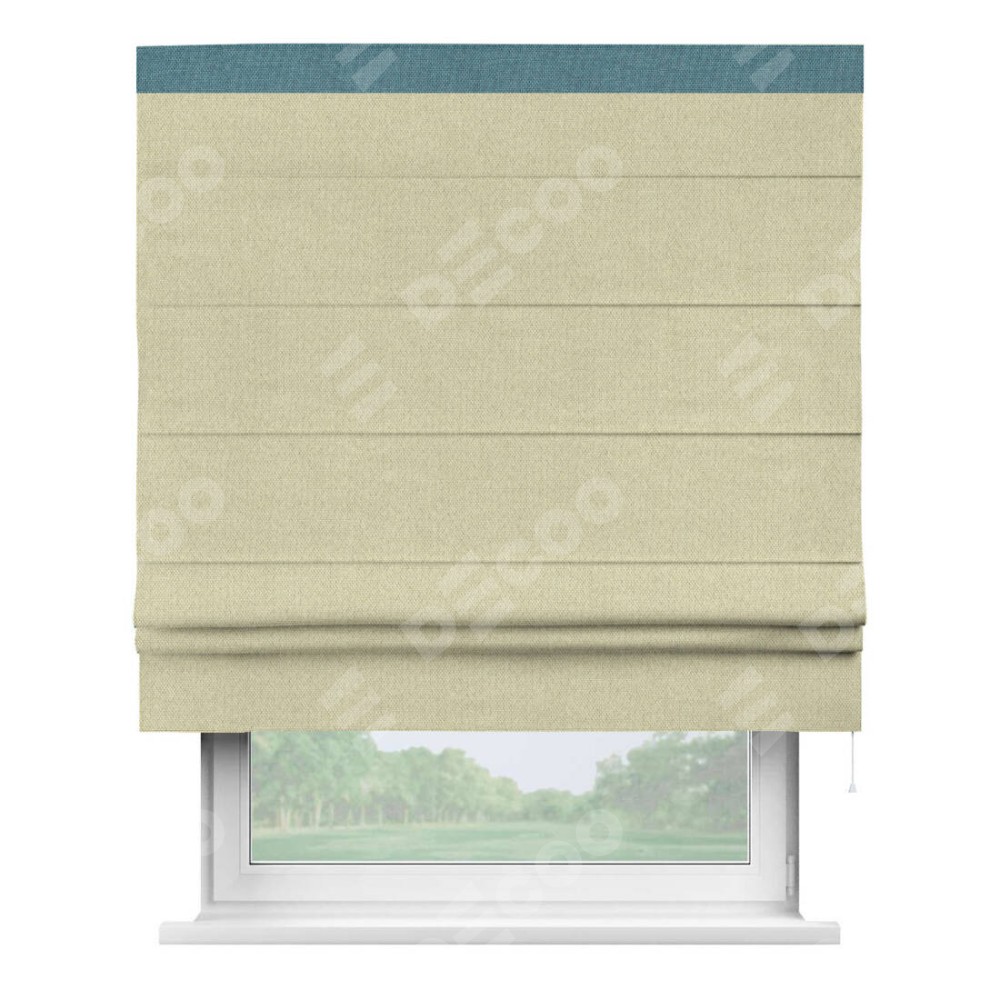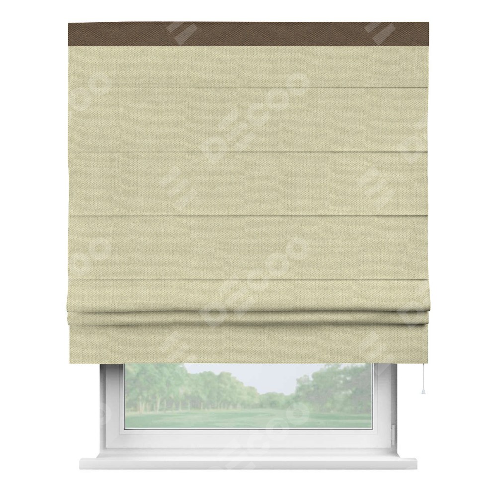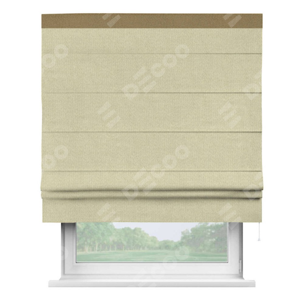 Римская штора производителя «Cortin», используется для проёма, пошита из ткани лён димаут шампань, артикул 90994. Отделка шторы кантом «Кинг», ткань для канта используется из льна димаут разной расцветки на выбор. Имеет универсальный механизм и подходит для монтажа: на потолок, на стену и в нишу.