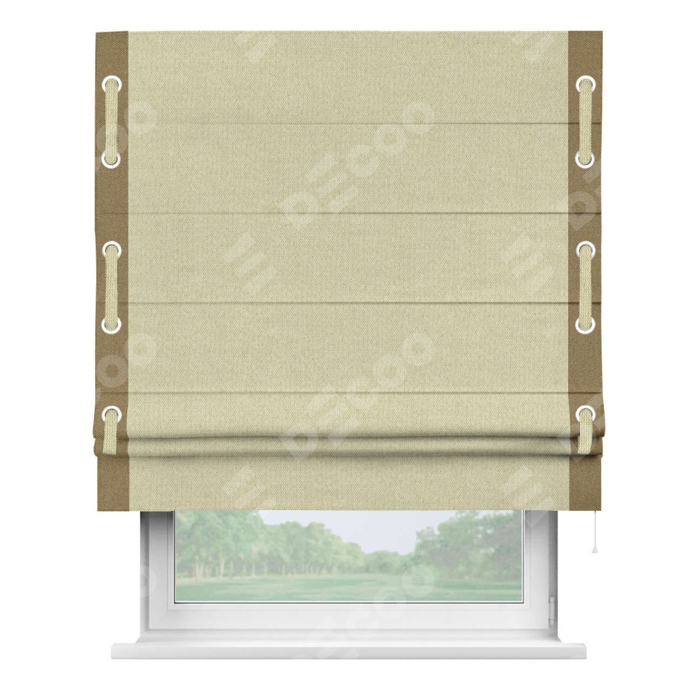 Римская штора производителя «Cortin», используется для проёма, пошита из ткани лён димаут шампань, артикул 90994. Отделка шторы кантом «Стрим Дуо» на кантах расположены люверсы с пояском, ткань для канта используется лён димаут разной расцветки на выбор. Ткань для пояска обычно используется из основной ткани шторы, а так же можно сделать из любой расцветки по желанию. Имеет универсальный механизм и подходит для монтажа: на потолок, на стену и в нишу.