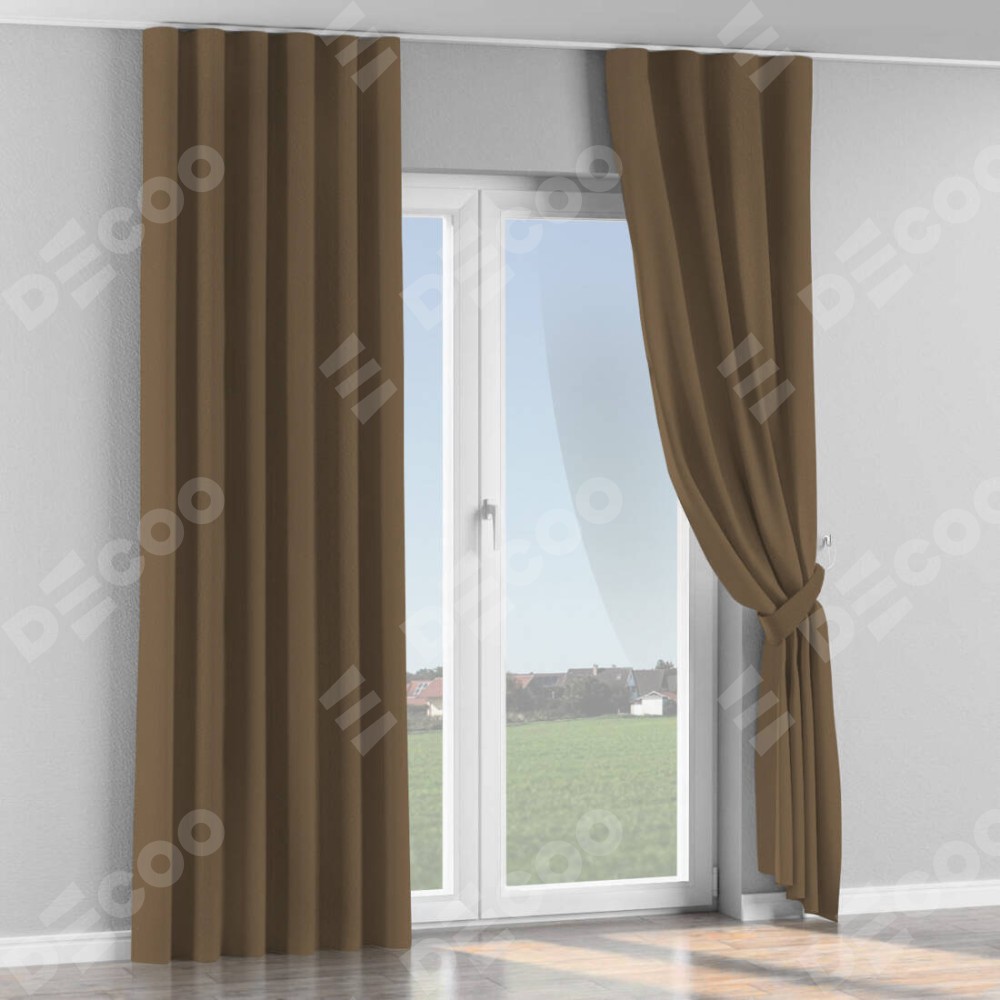 Комплект прямых штор, от производителя «Cortin», пошиты из ткани блэкаут однотонный коричневый, артикул ткани 91334. С изнаночной стороны в верхней части штор пристрачивается шторная лента с декоративными складками «Волна». Для создания элегантных складок прямые шторы шьются по стандарту с коэффициентом 1:2 (на 100 см. ширины проёма 200 см. ширины ткани).