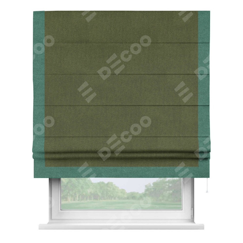 Римская штора производителя «Cortin», используется для проёма, пошита из ткани лён димаут салатовый, артикул 91002. Отделка шторы кантом «Виктория», ткань для канта используется из льна димаут разной расцветки на выбор. Имеет универсальный механизм и подходит для монтажа: на потолок, на стену и в нишу.