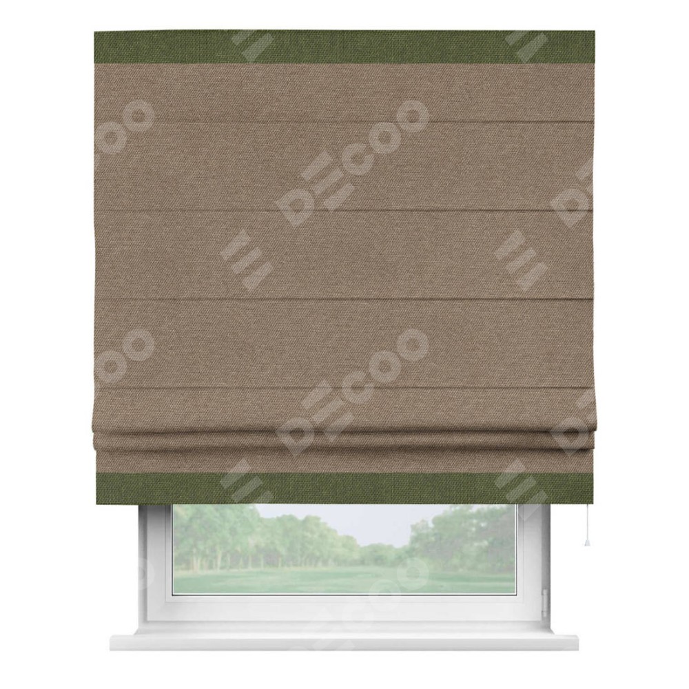 Римская штора производителя «Cortin», используется для проёма, пошита из ткани лён димаут коричневый, артикул 90996. Отделка шторы кантом «Горизонт», ткань для канта используется из льна димаут разной расцветки на выбор. Имеет универсальный механизм и подходит для монтажа: на потолок, на стену и в нишу.