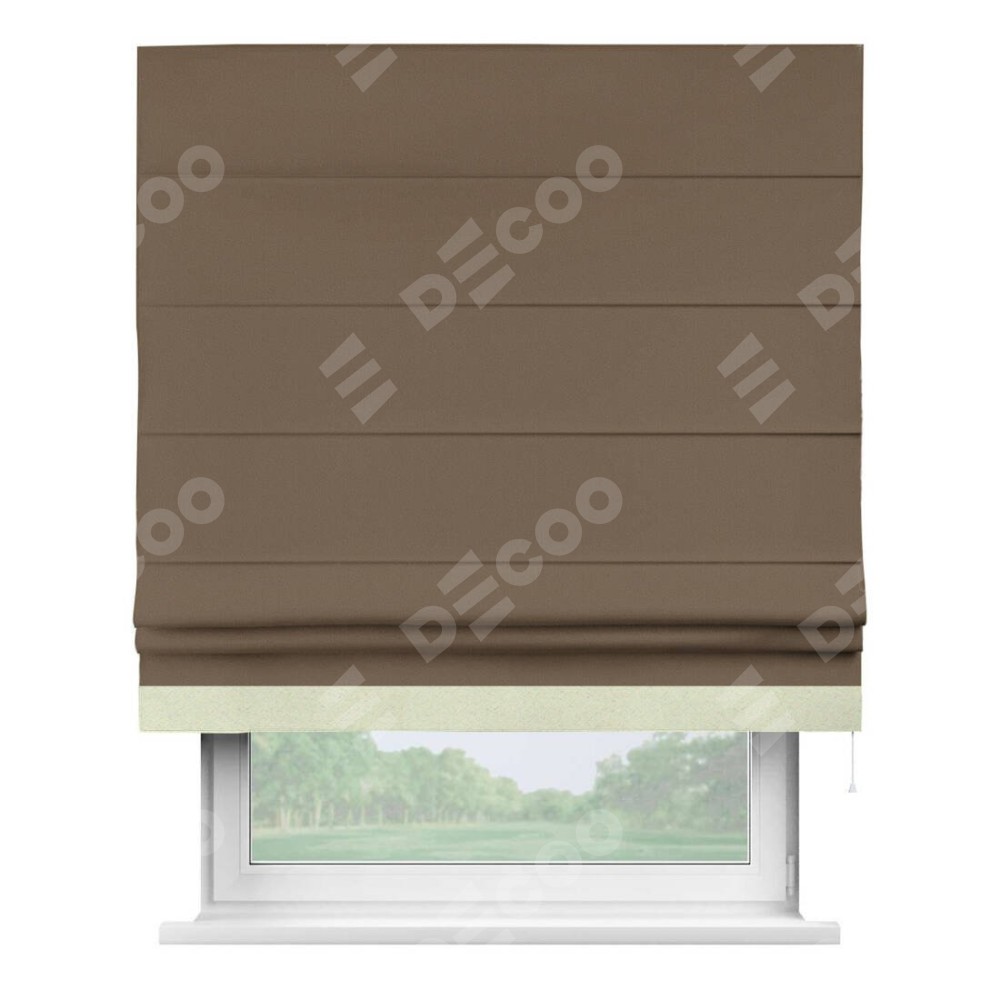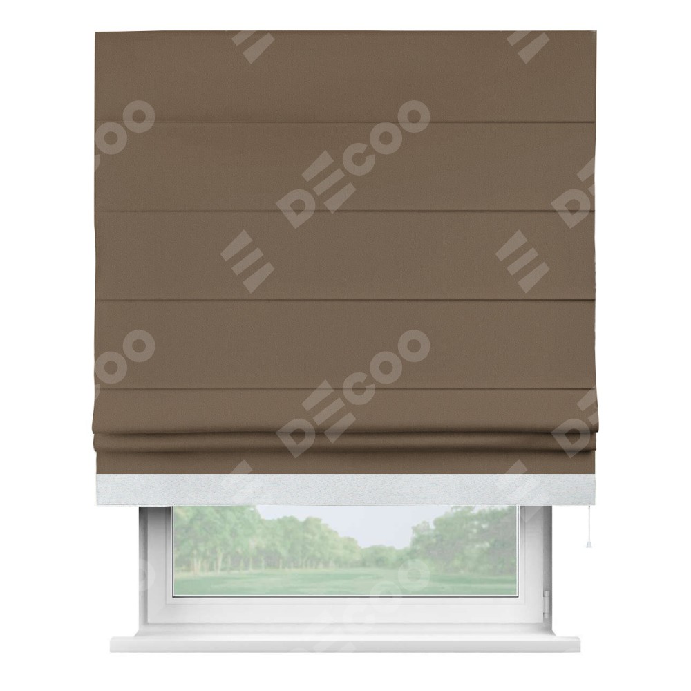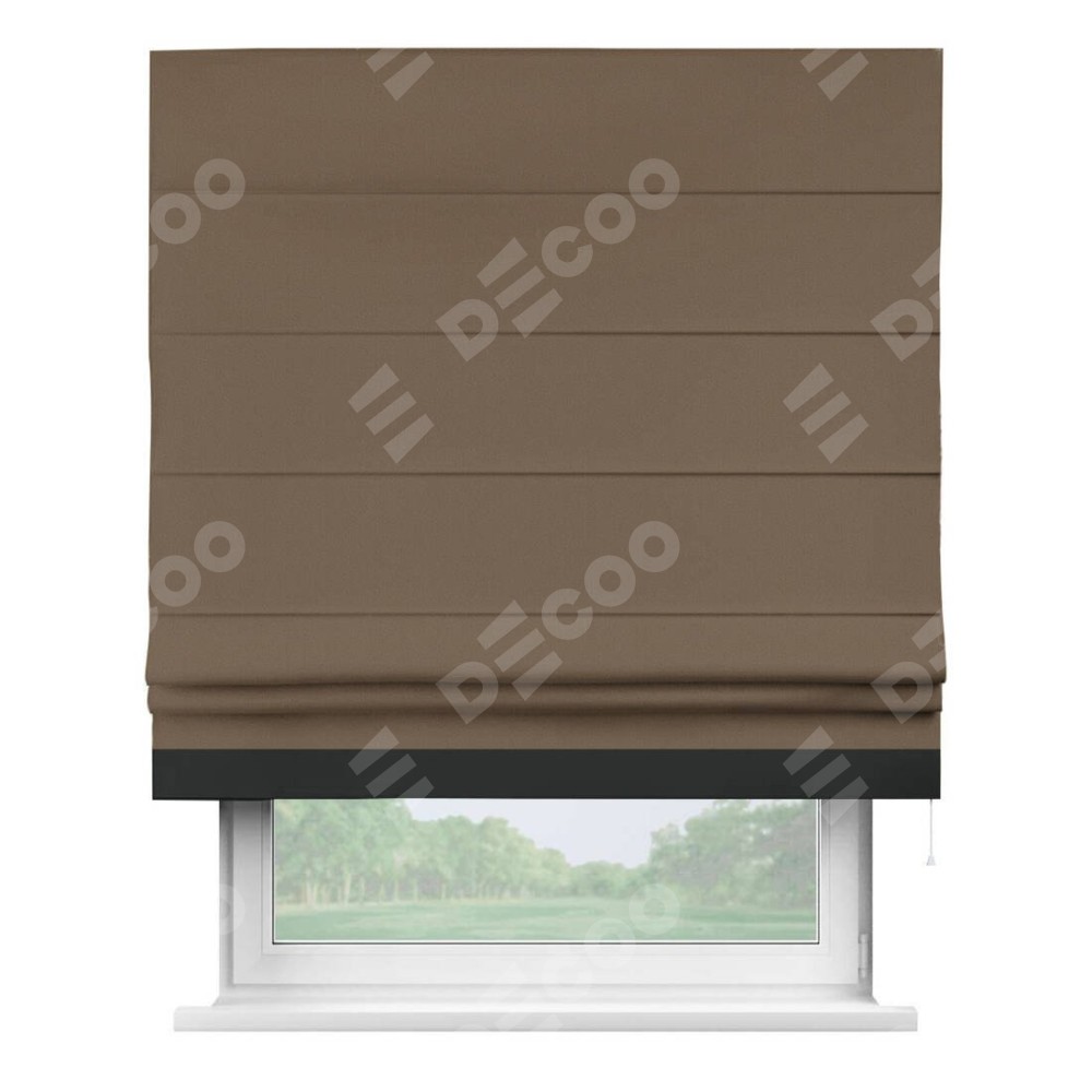 Римская штора производителя «Cortin», используется для проёма, пошита из ткани блэкаут однотонный коричневый, артикул ткани 91334. Отделка шторы кантом «Джестер», ткань для канта используется из блэкаута однотонного разной расцветки на выбор. Имеет универсальный механизм и подходит для монтажа: на потолок, на стену и в нишу.
