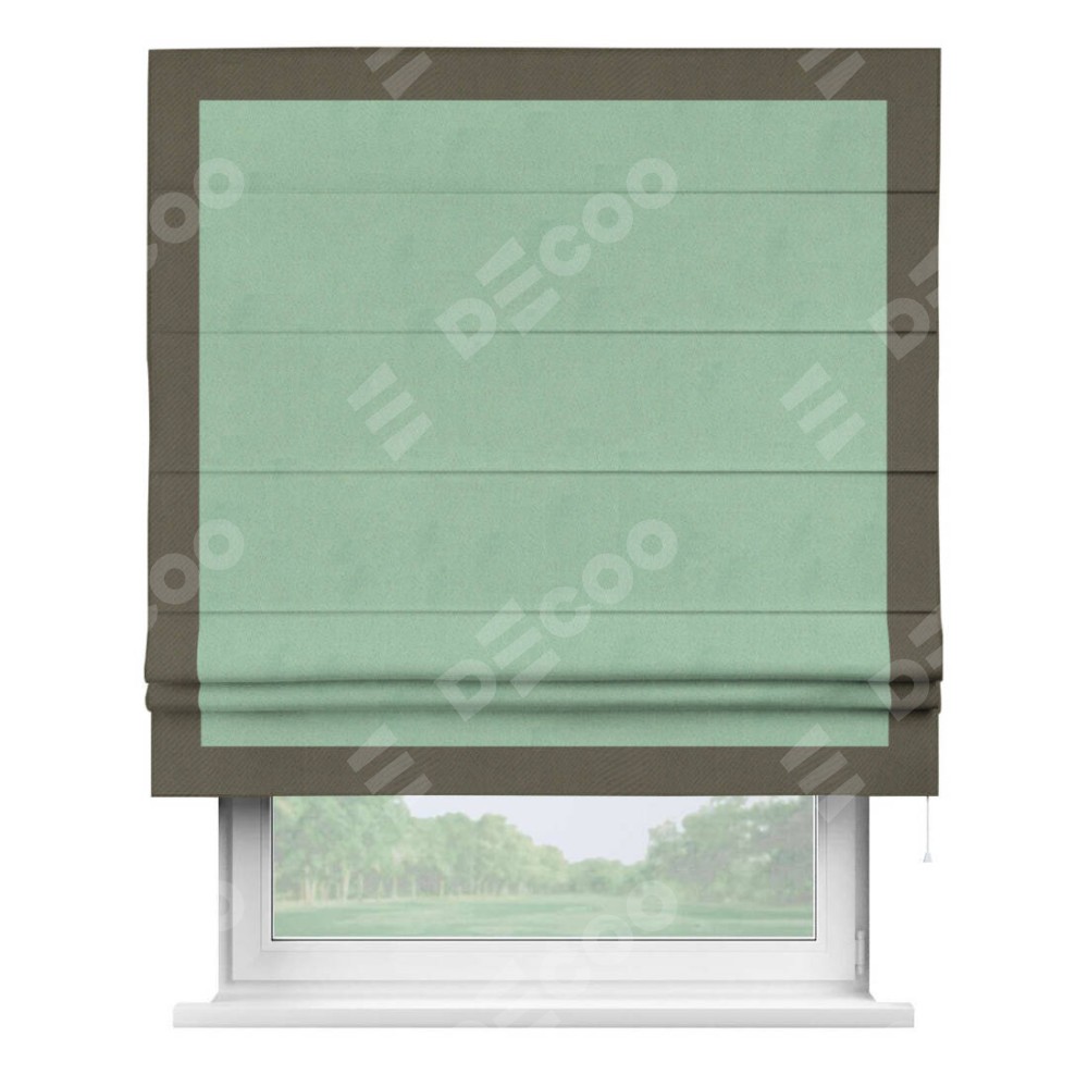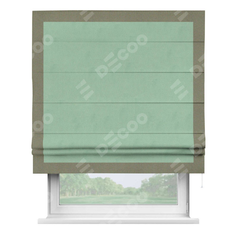 Римская штора производителя «Cortin», используется для проёма, пошита из ткани блэкаут однотонный ментоловый, артикул ткани 91572−1. Отделка шторы кантом «Чесс», ткань для канта используется из блэкаута однотонного разной расцветки на выбор. Имеет универсальный механизм и подходит для монтажа: на потолок, на стену и в нишу.