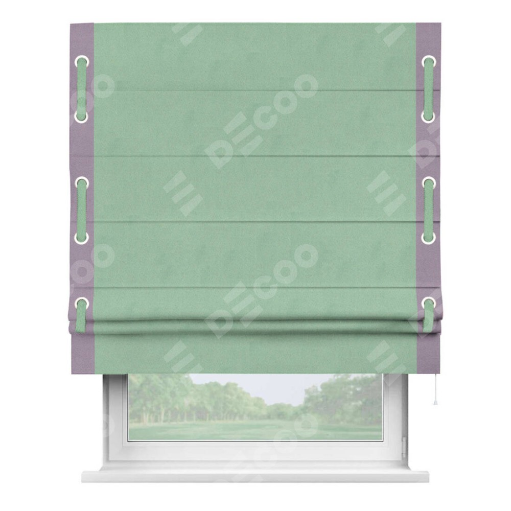 Римская штора производителя «Cortin», используется для проёма, пошита из ткани блэкаут однотонный ментоловый, артикул ткани 91572−1. Отделка шторы кантом «Стрим Дуо» на кантах расположены люверсы с пояском, ткань для канта используется из блэкаута однотонного разной расцветки на выбор. Ткань для пояска обычно используется из основной ткани шторы, а так же можно сделать из любой расцветки по желанию. Имеет универсальный механизм и подходит для монтажа: на потолок, на стену и в нишу.