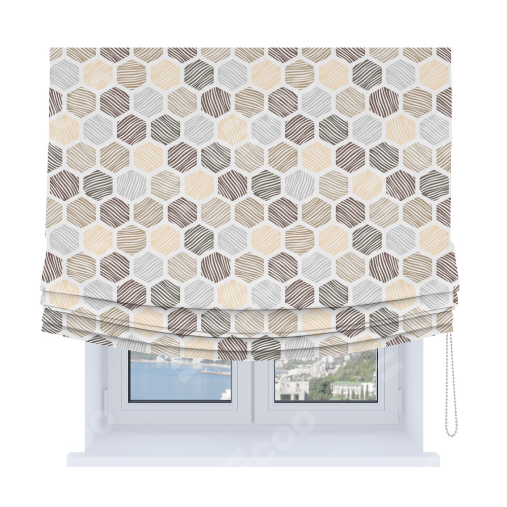 Римская штора Soft производителя «Cortin», используется для проёма, пошита из ткани блэкаут с нанесением сублимационной печати «Мозаика соты». Имеет универсальный механизм и подходит для монтажа: на потолок, на стену и в нишу. В отличие от стандартных римских штор, римская штора Soft не имеет горизонтальных вставок и нижнего отвеса. Это позволяет ткани произвольно драпироваться в свободные мягкие складки.