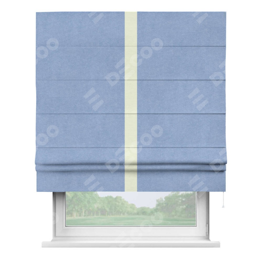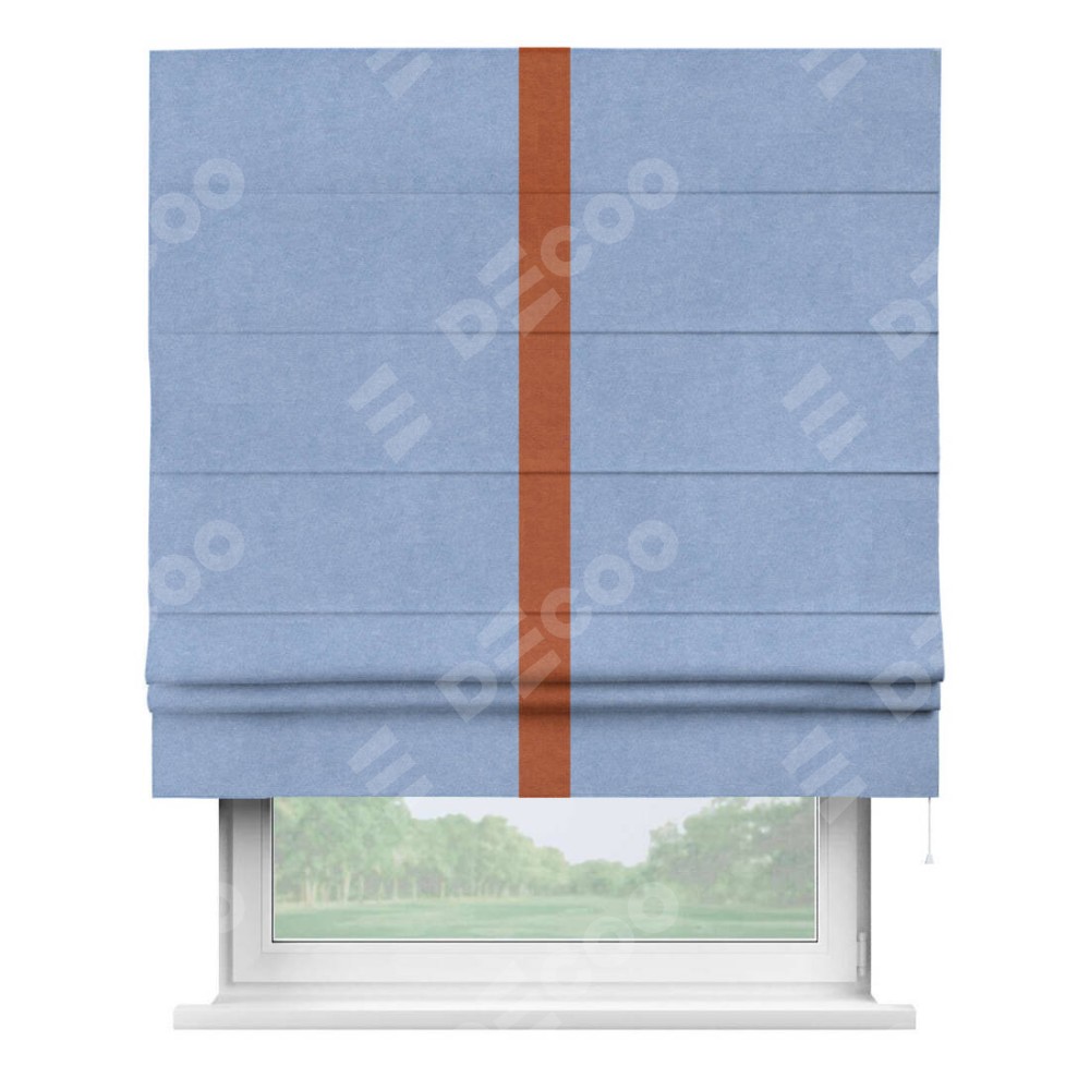 Римская штора производителя «Cortin», используется для проёма, пошита из ткани вельвет васильковый, артикул ткани 33799. Отделка шторы кантом «Хайвей», ткань для канта используется из вельвета разной расцветки на выбор. Имеет универсальный механизм и подходит для монтажа: на потолок, на стену и в нишу.