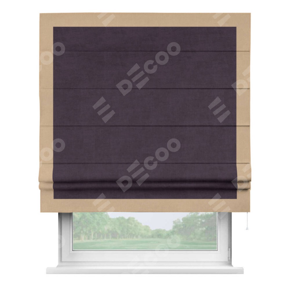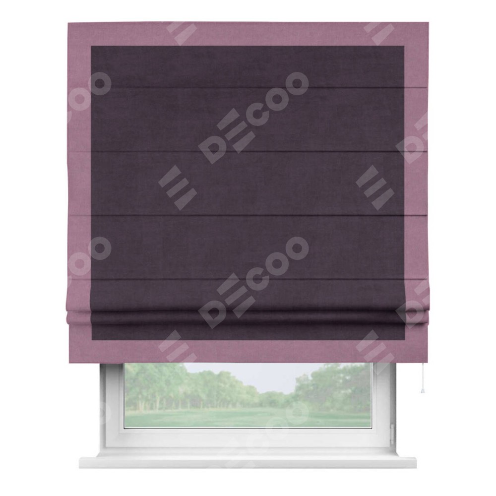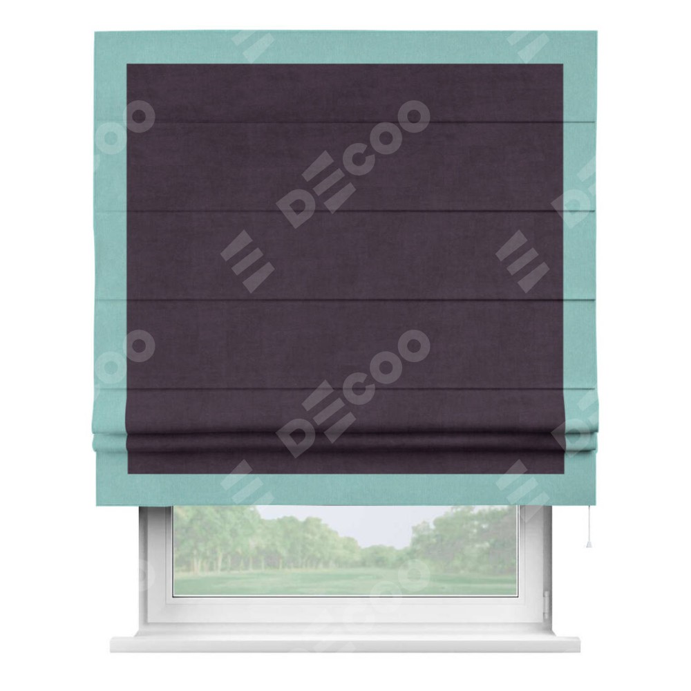 Римская штора производителя «Cortin», используется для проёма, пошита из ткани вельвет тёмно-фиолетовый, артикул ткани 72403. Отделка шторы кантом «Чесс», ткань для канта используется из вельвета разной расцветки на выбор. Имеет универсальный механизм и подходит для монтажа: на потолок, на стену и в нишу.